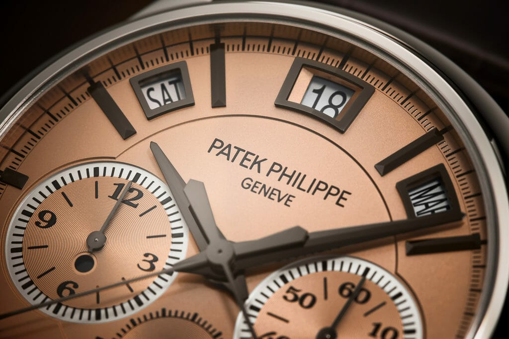 La nouvelle Quadruple Complication référence 5308P-010 est dotée d’un élégant cadran doré or rose opalin à la petite note « vintage », rehaussé par des index appliques de type « bâton » en or gris avec revêtement anthracite et par des aiguilles de type « dauphine » facettées en or gris avec revêtement anthracite. L’accent a été mis sur la lisibilité afin que s’affichent en toute clarté les treize indications pilotées par le calibre R CHR 27 PS QI. Le jour, la date et le mois du quantième perpétuel apparaissent dans trois guichets en arc de cercle entre 10h et 2h dotés d’un cadre rapporté en or gris avec revêtement anthracite – dont un guichet légèrement plus grand pour la date, l’information la plus importante. Ces affichages calendaires sont complétés par les deux guichets ronds de l’indication jour/nuit à 8h et du cycle des années bissextiles à 4h – des éléments indispensables pour le réglage du calendrier.