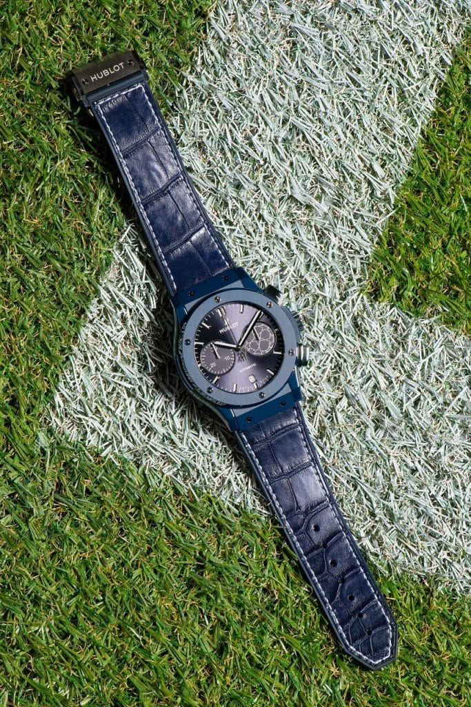 Tout comme les maîtres du Temps étaient vêtus de bleu, Hublot crée une montre entièrement nuancée de la couleur emblématique de la compétition. La Classic Fusion Chronograph UEFA Champions LeagueTM, montre accréditée officielle de la compétition, s’impose dans un boîtier de 45mm de diamètre en céramique bleue polie et satinée. Le cuir de la victoire s’affiche en alligator bleu surpiqué d’une couture blanche. Son cadran soleillé bleu affiche en ton sur ton le mythique Starball et ses 8 étoiles, formant un ballon qui est l’emblème de la compétition. Le fond de la boîte revêt quant à lui le logo de l’UEFA Champions League™.