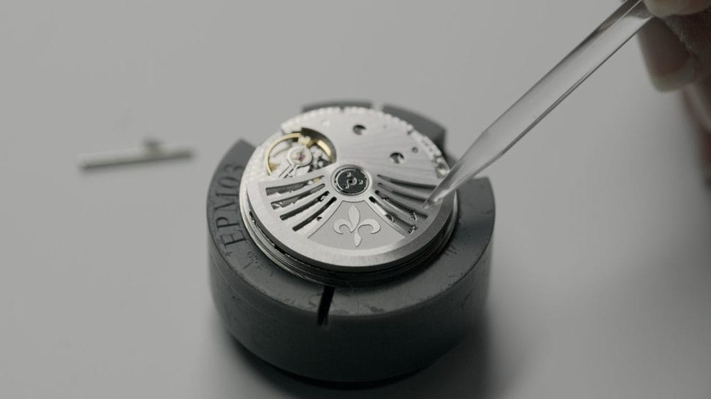 Grâce à son système breveté d’entraînement de date, la correction peut être effectuée à tout moment, quelle que soit la position des aiguilles. Le mouvement est fabriqué à partir de composants produits dans un rayon de 80 km autour de Morteau, avec 72 % d’origine française.
