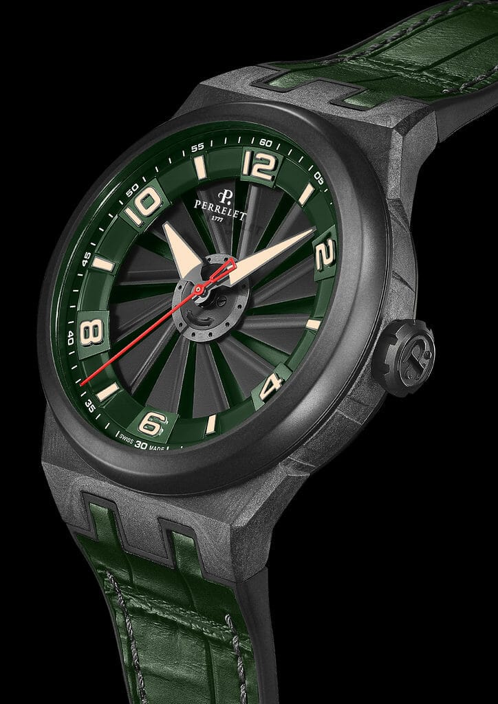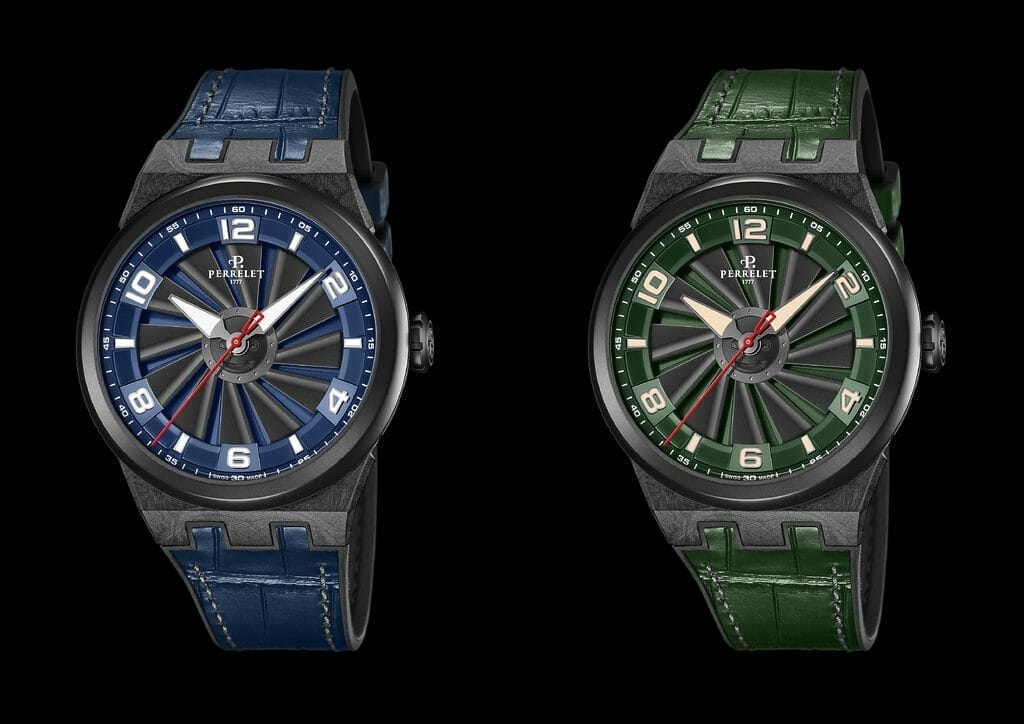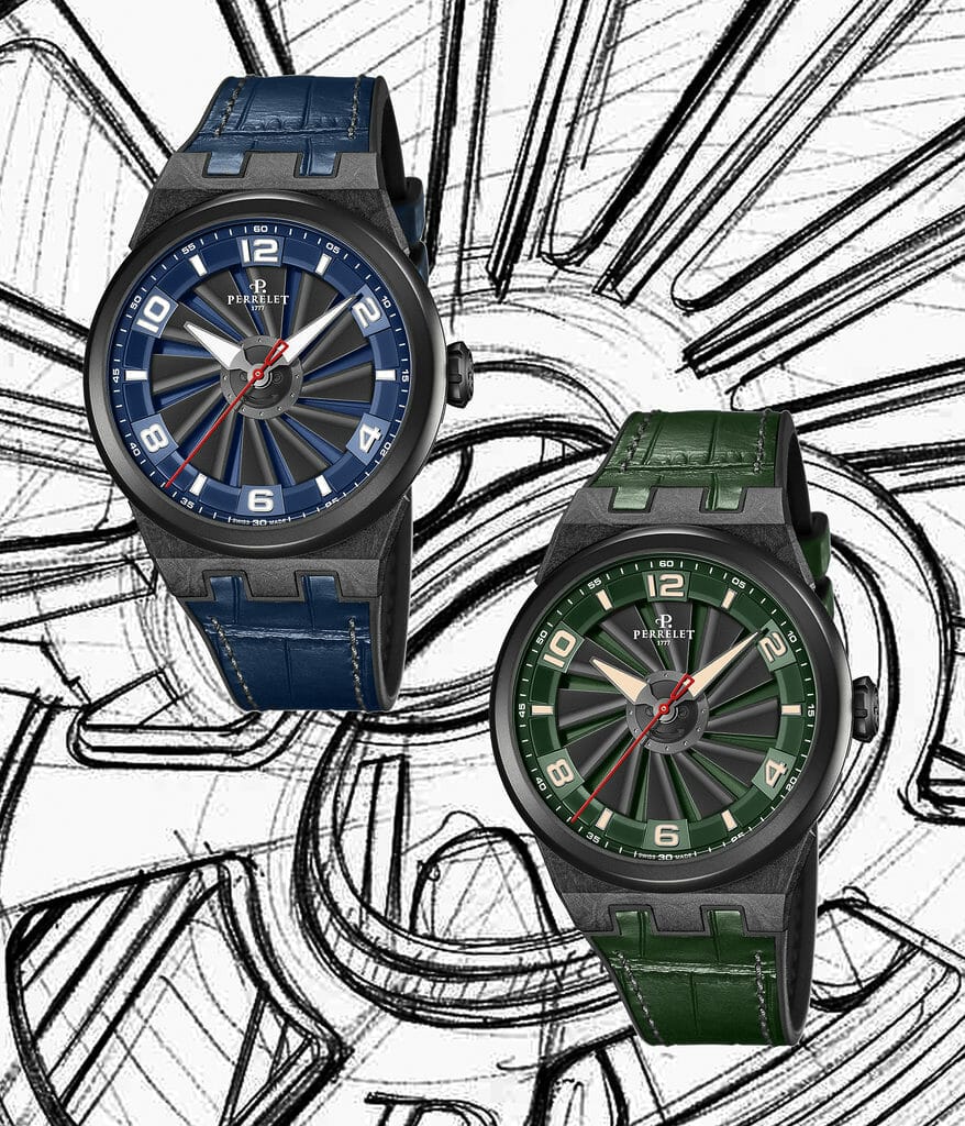 La co-star de ces nouvelles propositions est la turbine à 12 pales qui rappelle l’hélice d’avion dont elle s’inspire. Cette turbine, composant conçu pour tourner à grande vitesse du côté du cadran et nécessitant une grande précision lors de son assemblage, ressemble à un double rotor. Contrairement à la technologie Double Rotor, la première brevetée par Perrelet laquelle est fonctionnelle car connectée au mouvement automatique qui tire son énergie de deux rotors, la Turbine quant à elle n’est pas reliée au barillet car cela ralentirait sa vitesse de rotation. Elle n’a qu’une fonction purement esthétique qui permet des effets d’optique accrocheurs et donne à la montre une identité unique.