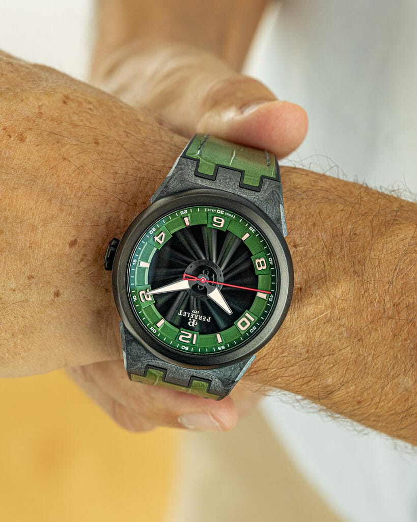 « Turbine Carbon Forest Green » et « Turbine Carbon Midnight Blue » sont équipées du calibre automatique P-331-MH, battant à 28 800 alternances par heure et offrant une réserve de marche de 42 heures lorsqu’il est entièrement remonté. Ce mouvement est développé par Soprod qui compte six sites de production (groupe Festina), propriété de Miguel Rodriguez, à qui appartient la marque et qui fabrique tous les garde-temps Perrelet. Hautement fiable et précis dans ses performances, ce puissant « moteur » est garanti par les certifications COSC et Chronofiable obtenues après avoir subi une série de tests intensifs.