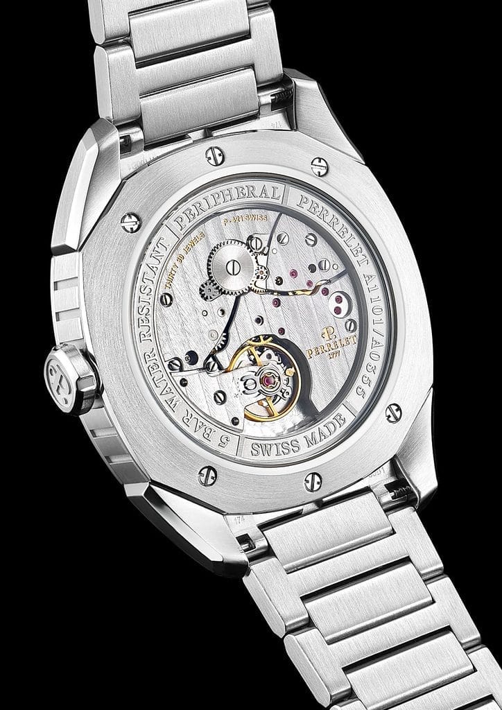 L’identité de Perrelet repose sur l’innovation dans les mouvements automatiques. Dès 1777, Abraham-Louis Perrelet invente le premier calibre automatique. Depuis, la Maison n’a cessé de repousser les limites de la mécanique horlogère. En 1995, elle présente le Double Rotor, puis en 2009, la Turbine, un dispositif esthétique et dynamique. Aujourd’hui, elle se distingue avec un nouveau développement : la masse oscillante périphérique côté cadran.