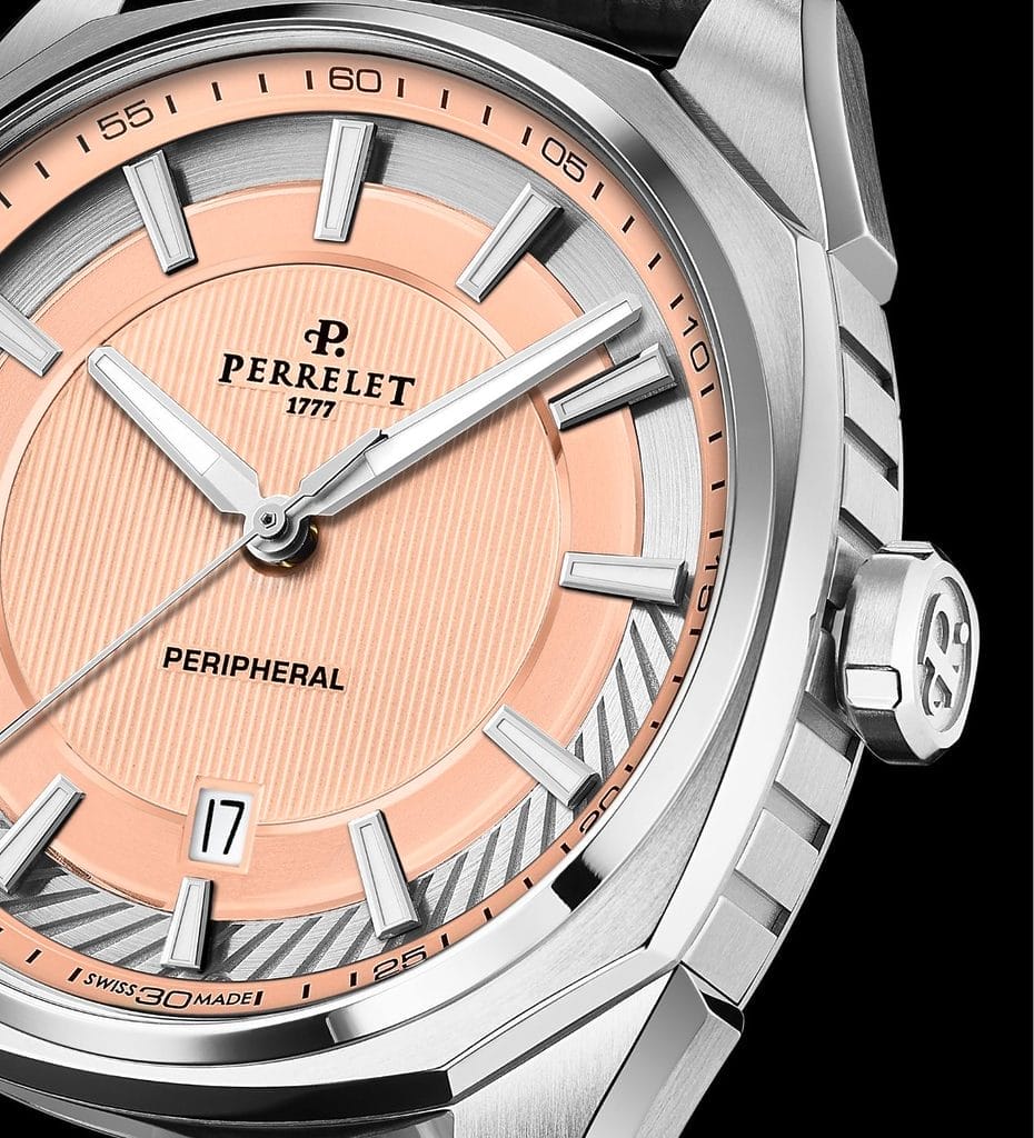 Perrelet enrichit sa collection LAB Peripheral avec de nouvelles déclinaisons inédites : pour la première fois, un bracelet en acier fait son apparition, accompagné d’une élégante teinte saumon. Cette couleur subtile met en valeur l’élément signature de la collection : la masse oscillante périphérique visible côté cadran.
