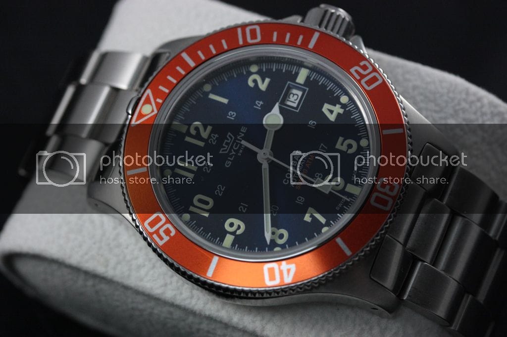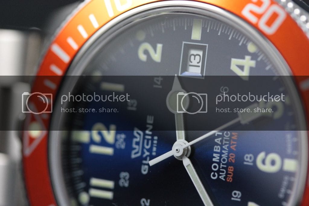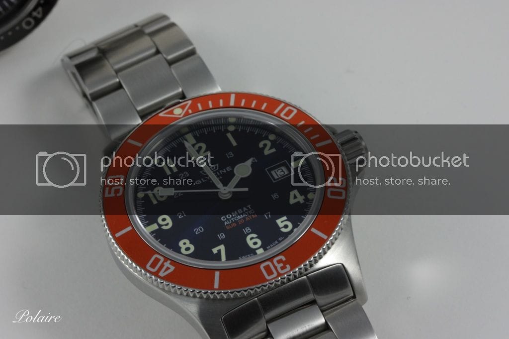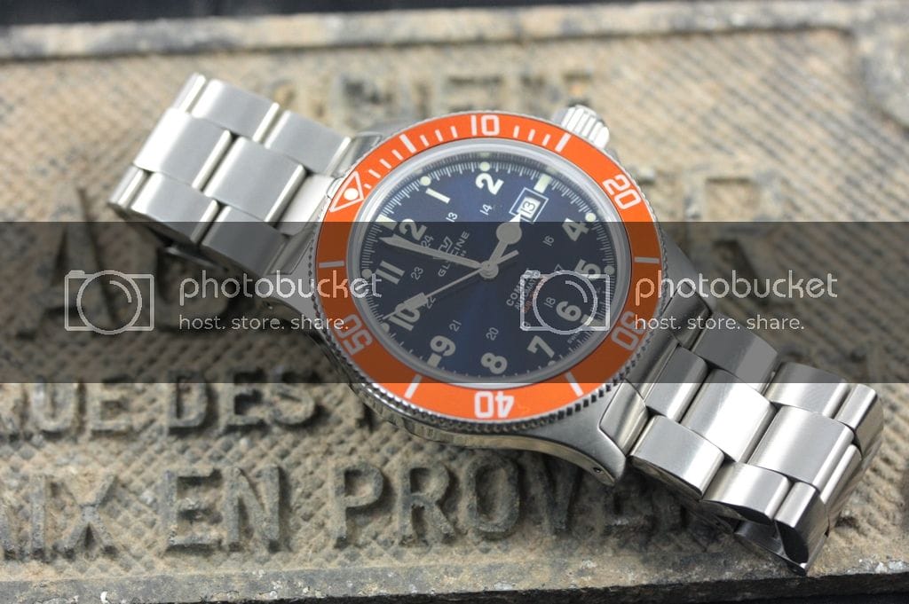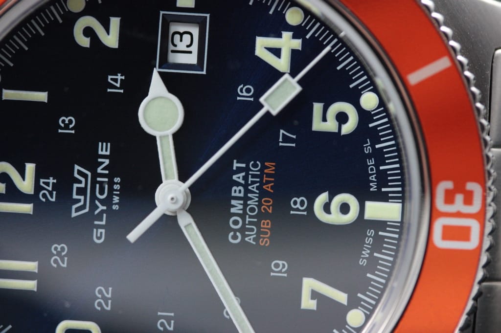 La Glycine Combat Sub : Le cadran est un peu plus chargé mais les chiffres arabes lui donnent un look sympathique. C’est à mon avis une bonne alternative à la Marathon que je trouve trop épaisse et trop petite. Le cadran est bien fini, les index sont parfaitement positionnés. Par contre, pas de logo appliqué, ni d’index cerclés.