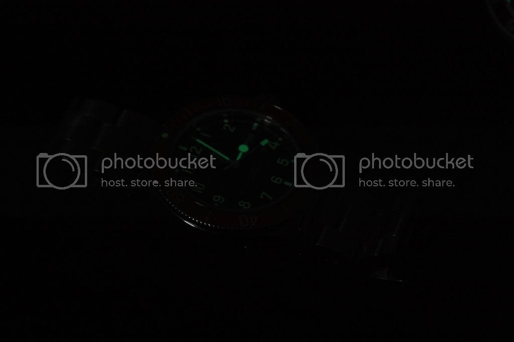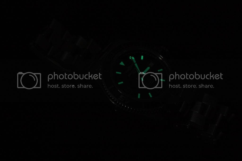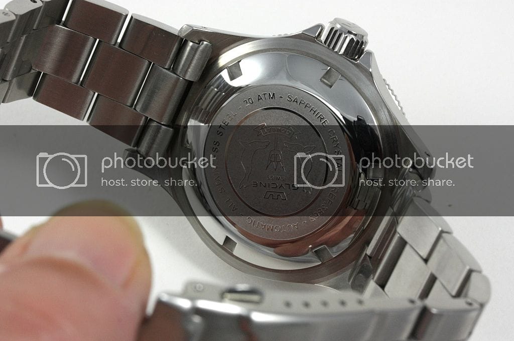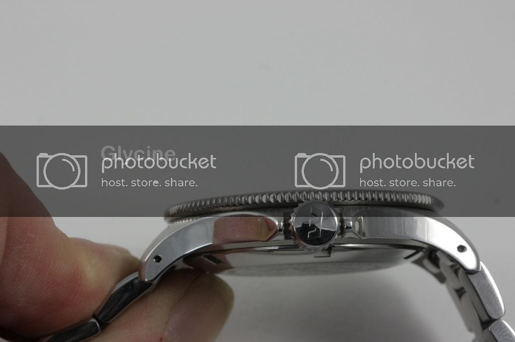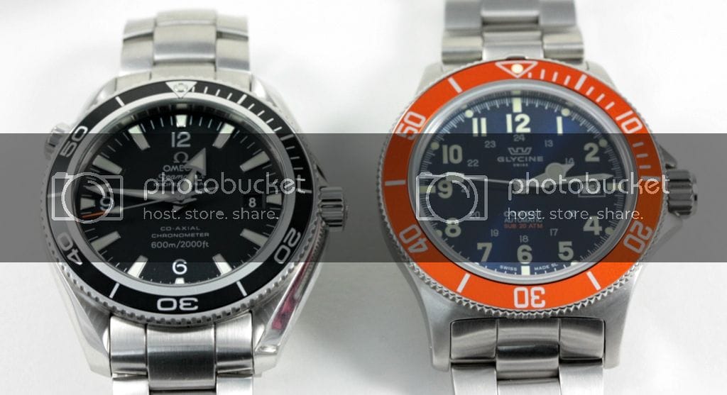 La Glycine Combat Sub : Le cadran est un peu plus chargé mais les chiffres arabes lui donnent un look sympathique. C’est à mon avis une bonne alternative à la Marathon que je trouve trop épaisse et trop petite. Le cadran est bien fini, les index sont parfaitement positionnés. Par contre, pas de logo appliqué, ni d’index cerclés.