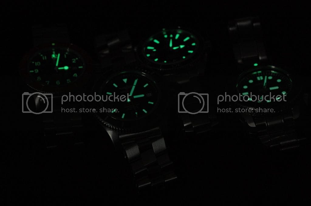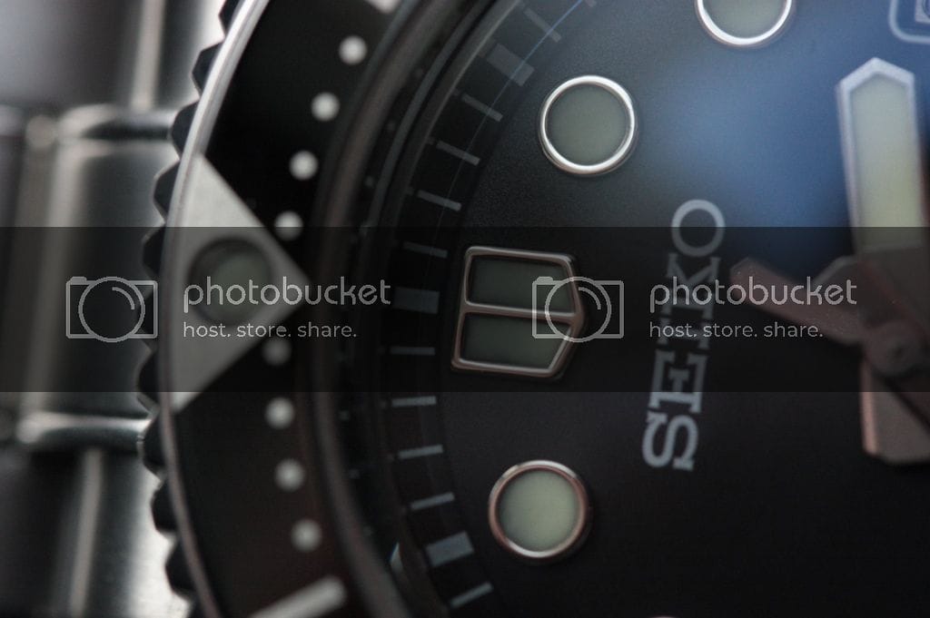 La Seiko MarineMaster : La lunette est de toute beauté. On croirait de l’acier ou du verre !!! Elle est divine… Les index eux sont cerclés et d’un blanc cassé donnant un look vintage au cadran. Malgré les 44 mm de la montre, la faible ouverture du cadran lui donne un air de 40~42 mm. C’est vraiment le point fort de cette montre, les reflets de lumière sur le verre (pas saphir contrairement aux trois autres) et sur la lunette font qu’elle étonne à chaque regard.