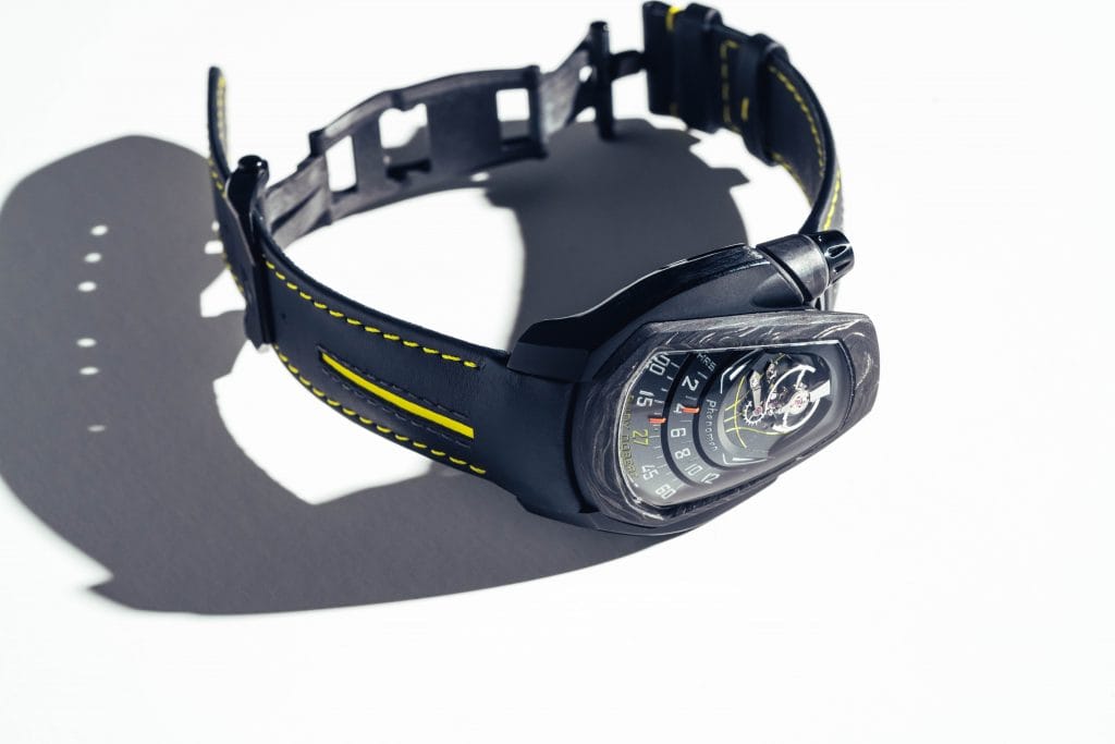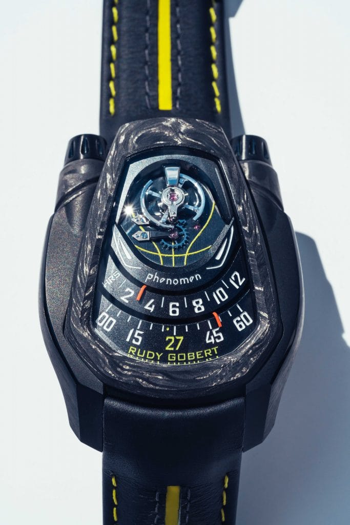 Pour Rudy, Alexandre va imaginer une Axiom un peu particulière, avec des codes couleurs adaptés et le numéro 27 inscrit sur le cadran, comme celui que la star du Jazz porte sur son maillot. Le premier modèle d’une série de 27 PHENOMEN Axiom Carbone, avec son mouvement PH-010 exceptionnel à double barillet et aiguilles rétrogrades, que le fondateur de la marque a lui-même livré à son ami.