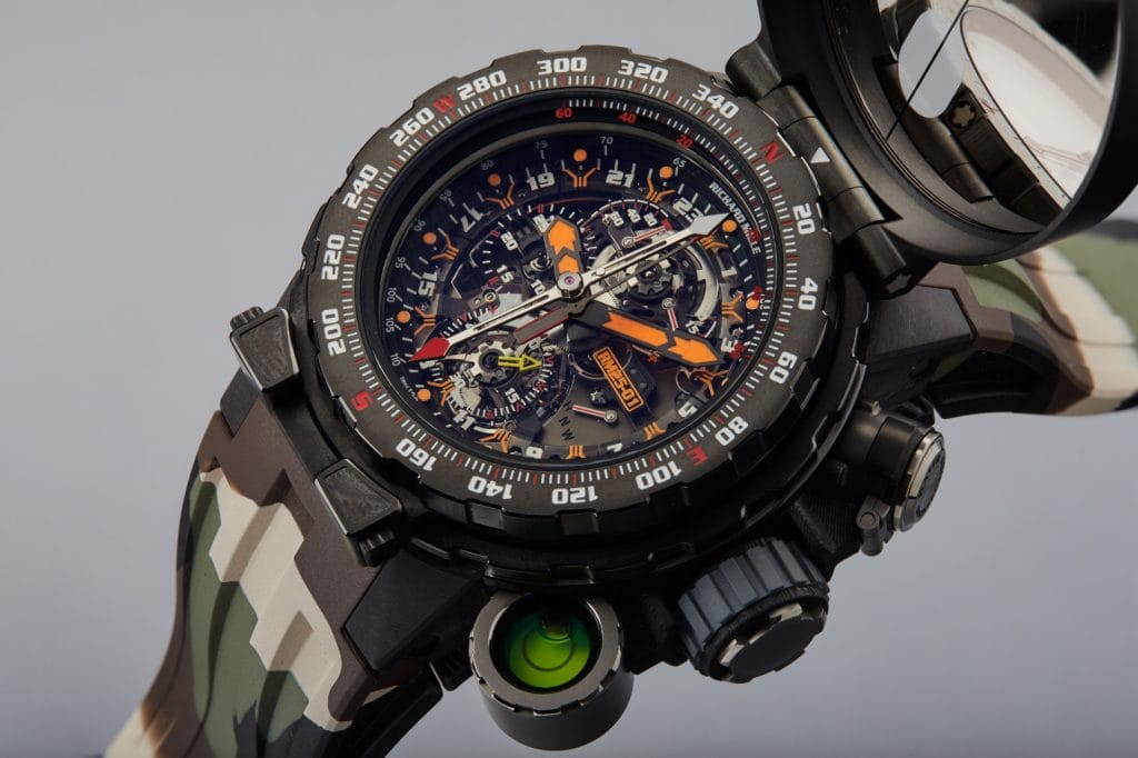 Avec un éventail vertigineux de caractéristiques techniques, le chronographe Adventure Tourbillon est optimisé pour aider à la survie. Conçu pour être un outil de survie indispensable, le RM25-01 comprend un tourbillon pour la précision, un chronographe pour suivre le temps écoulé, une boussole à lunette amovible et un couvercle en carbone, un niveau pour favoriser la précision lors de l’utilisation de la boussole et un petit compartimente au-dessus. La couronne peut contenir des comprimés de purification d’eau pour les urgences. Faisant partie de l’une des 20 montres en édition limitée fabriquées, cette RM025-01 est également proposée avec une lettre manuscrite personnellement écrite et signée par Monsieur Stallone sur son papier à lettres privé.