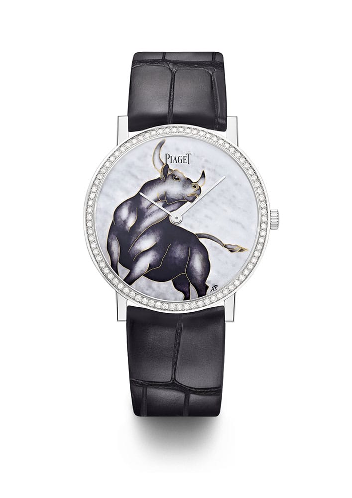 Pour honorer cet animal du zodiaque puissant et digne de confiance, Piaget immortalise le bœuf sur le cadran de l’une de ses montres les plus emblématiques, l’Altiplano, en émail grand feu cloisonné. Le cadran a été créé par la célèbre maître-émailleuse Anita Porchet. Cet art décoratif vieux de 4000 ans consiste à transférer dans un premier temps le dessin sur la surface du cadran en créant, à l’aide de fils d’or, des séparations miniatures, également appelées cloisons, dans lesquelles sont appliqués les différents pigments d’émail. Le cadran est ensuite cuit plusieurs fois au four à des températures comprises entre 820 °C et 850 °C. Une fois terminé, le cadran est verni, fixant l’image pour toujours.