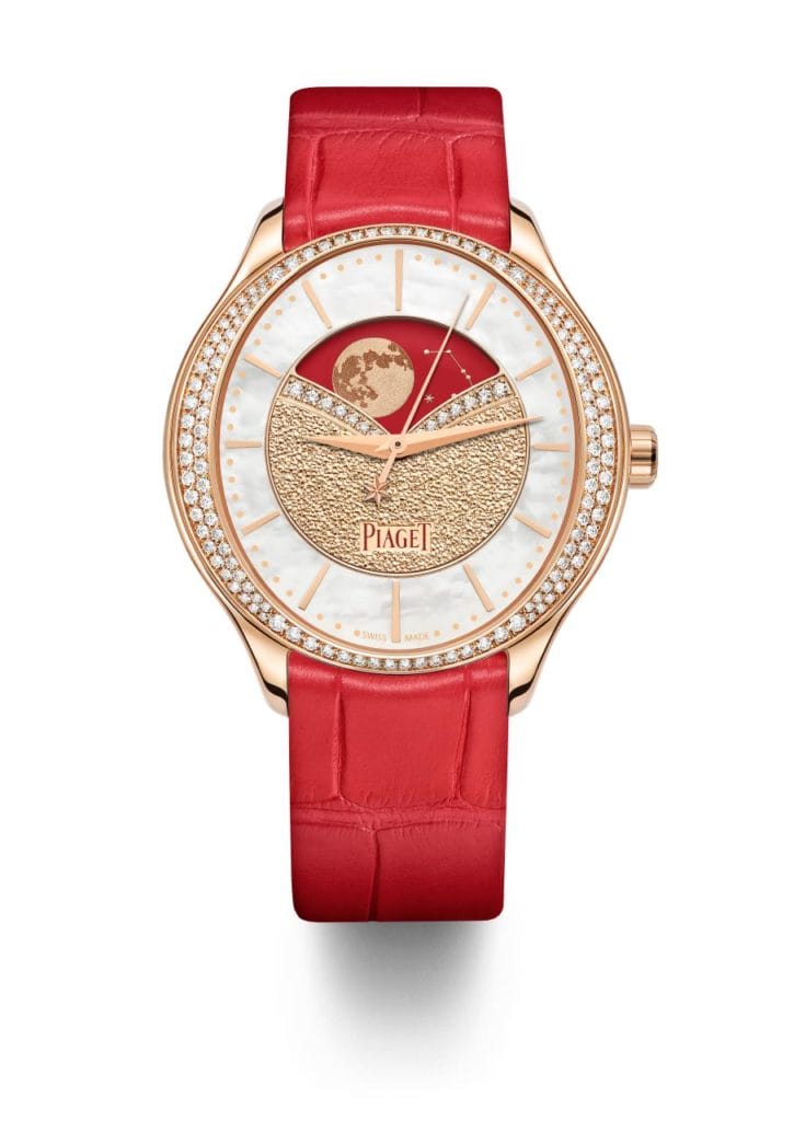 Le garde-temps Limelight Stella, avec sa complication des phases de la Lune et son ciel de nuit étoilée, est disponible dans un boîtier en or rose 18 carats de 36 mm habillé de 126 diamants taille brillant sur la lunette (env. 0,65 carat). Quatorze diamants taille brillant scintillent également sur son cadran en nacre (env. 0,05 carat) qui affiche une grande phase de la Lune dans une couleur rouge inédite. La couleur rouge est associée au Nouvel An chinois car elle évoque la vie, la joie, la prospérité et le courage. Ce garde-temps est animé par le mouvement à remontage automatique 584P de Piaget et indique les heures, les minutes, les secondes et les phases de la Lune. Il s’accompagne d’un bracelet en alligator rouge doté d’une boucle ardillon en or rose 18 carats. La Limelight Stella sera disponible exclusivement en Chine et à Hong Kong à partir de février, et dans le reste du monde à partir d’avril.