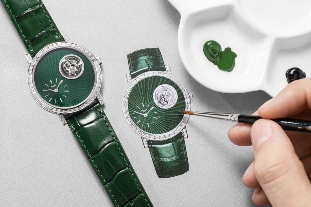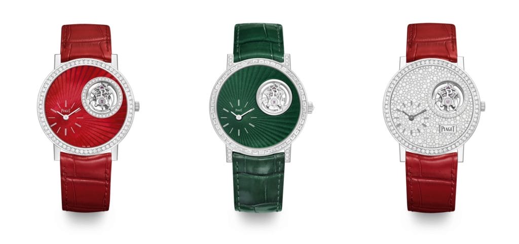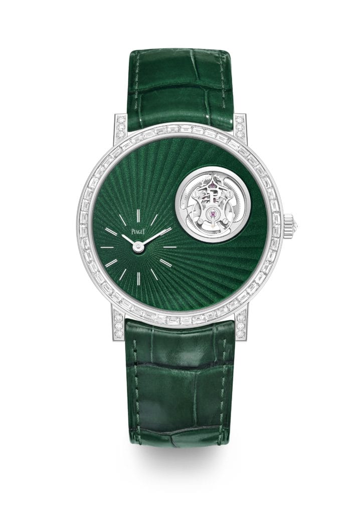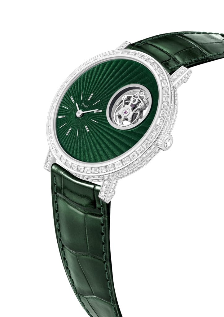Le modèle 41 millimètres propose quelques boîtes supplémentaires avec options en or blanc ou rose, qui peuvent être serties de diamants taille brillant ou taille baguette. Piaget offre également la possibilité de décorer l’Altiplano Tourbillon avec des pierres précieuses taille baguette. Émeraudes, saphirs ou rubis ajoutent une touche de couleur et leur éclat scintillant. Le cadran peut, quant à lui, s’orner d’un décor en émail grand feu guilloché à la main, d’un serti neige ou d’une laque avec guillochage soleil pouvant prendre n’importe quelle couleur.