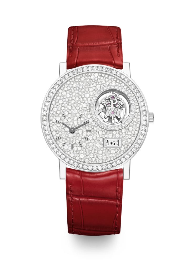 En 2017, Piaget a fêté le 60ème anniversaire de son mouvement extra-plat avec le modèle extra-plat Altiplano et son tourbillon volant, qui met le mouvement au service du design. Ce mouvement de manufacture à remontage manuel affiche l’heure à huit heures et le tourbillon à deux heures. Doté de 157 composants extra-plats et extra-légers, comme une cage d’à peine 2,88 millimètres, trois ponts en titane ne pesant pas plus de 0,2 gramme et certaines pièces dont l’épaisseur ne dépasse pas celle d’un cheveu humain, le modèle Altiplano Tourbillon de Piaget est une prouesse d’ingénierie. Il détient également un brevet pour le mécanisme de sa tige, qui intègre une roue intermédiaire ressemblant à un escalier. Celle-ci permet à l’utilisateur de régler l’heure du cadran excentré — une autre première dans l’industrie horlogère.
