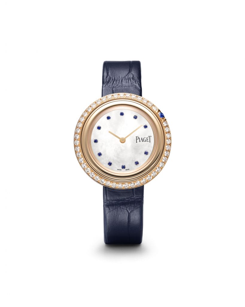 Calibre à quartz de manufacture Piaget 56P, boîtier : 34 mm en or rose, cadran en nacre orné de 11 saphir bleus, boîtier serti de 45 diamants et d’un saphir bleu, bracelets interchangeables en cuir d’alligator bleu et blanc, carat au total : 45 diamants d’env. 1.409 ct au total, 12 saphirs d’env. 0.177 ct au total. 18 500€.
