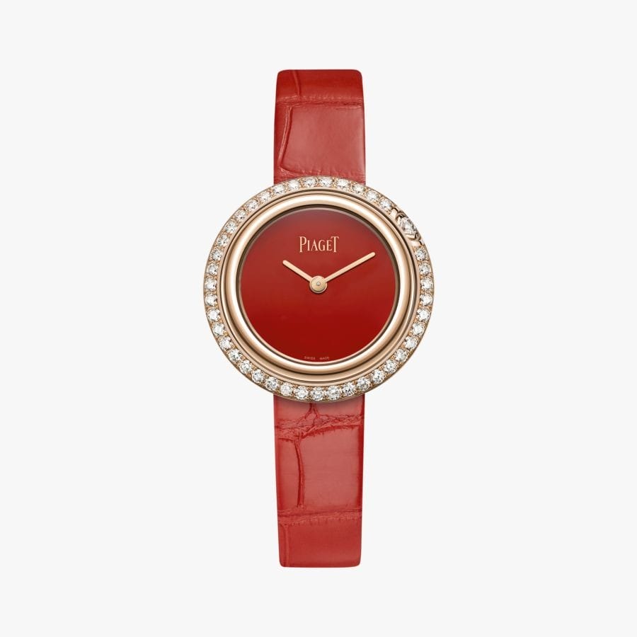 Montre Possession, 29 mm. Boîtier en or rose 18k serti de 42 diamants taille brillant (env. 1,04 ct). Cadran en cornaline naturelle. Bracelet interchangeable, montre livrée avec un second bracelet. Mouvement quartz Piaget 56P.