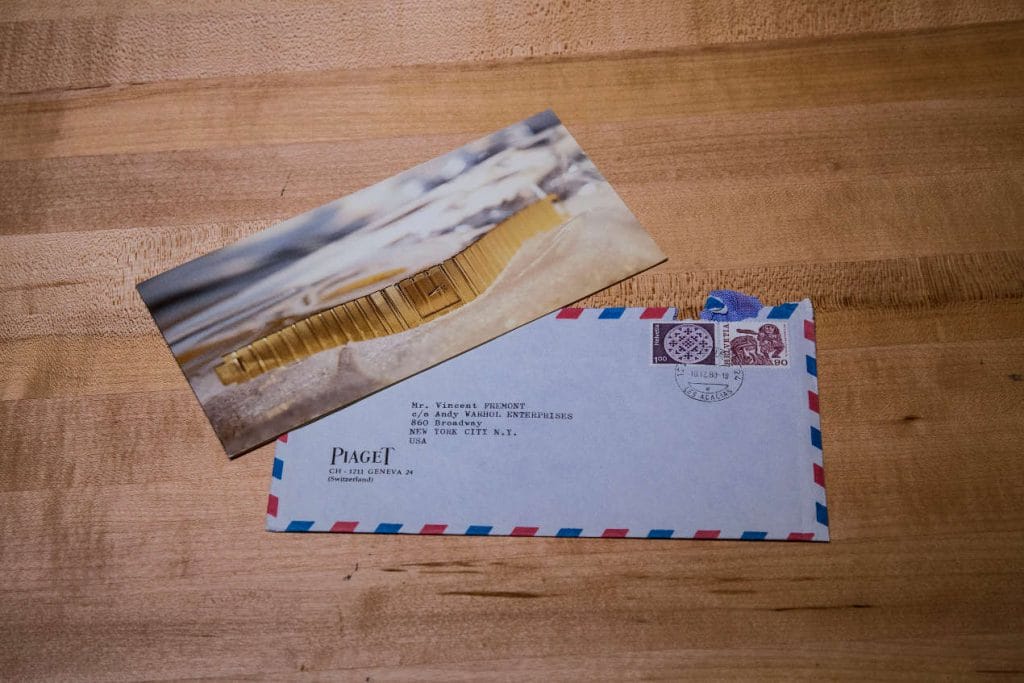 Une montre lingot d’or à secret, des photos intimes de soirées envoyées par Yves Piaget dans leurs enveloppes originales et autres curiosités témoignent du lien unique entre Yves Piaget & l’artiste depuis 1979 qu’aujourd’hui la Maison Piaget œuvre à faire perdurer au travers de ce partenariat.