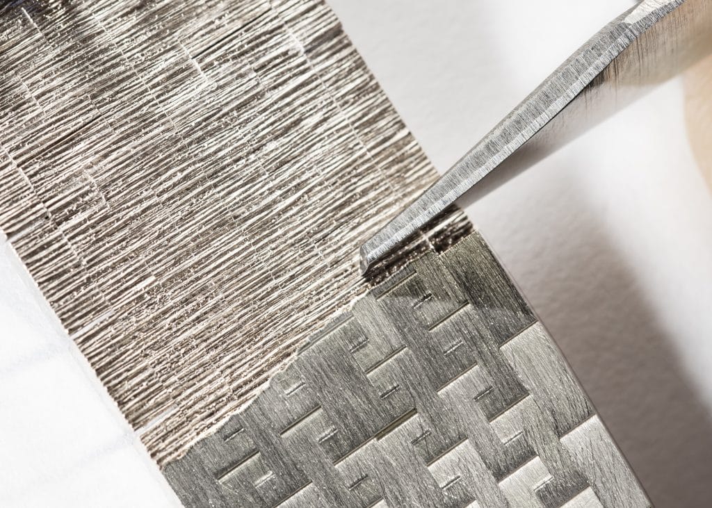 Le bracelet en or blanc du nouveau garde-temps a été conçu de cette manière, puis gravé du décor « Palace », l’un des motifs les plus emblématiques de Piaget, qui requiert huit heures de travail. Seuls quelques artisans travaillant dans les « Ateliers de l’Extraordinaire » ont l’expertise nécessaire pour graver ce motif à la main.