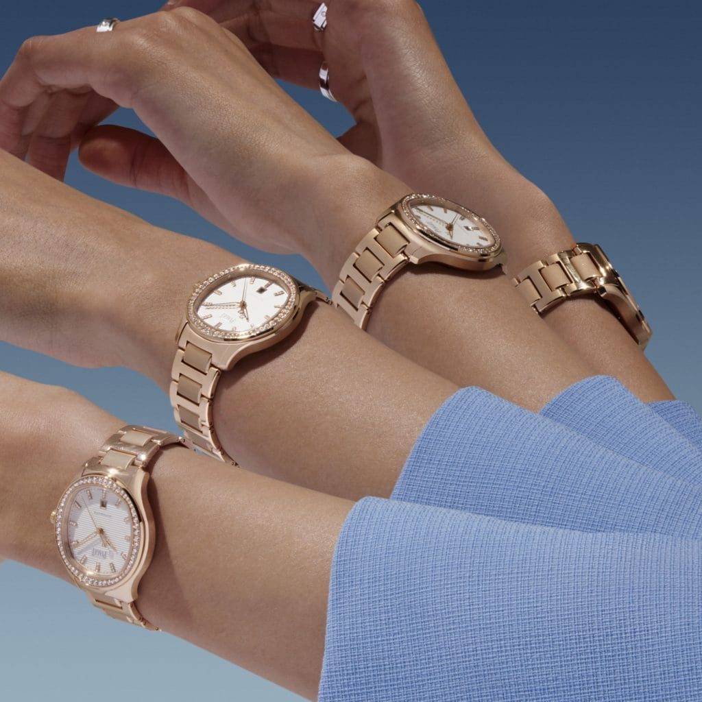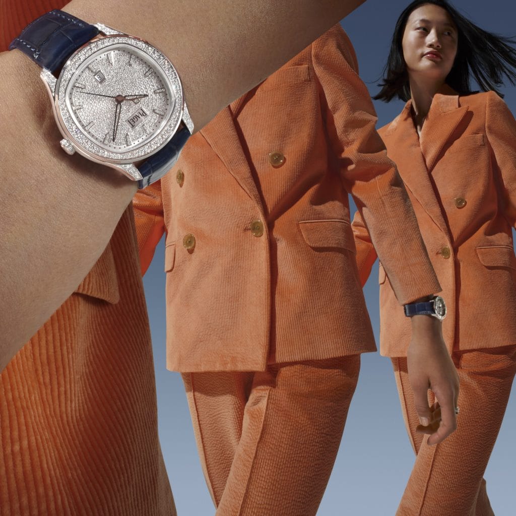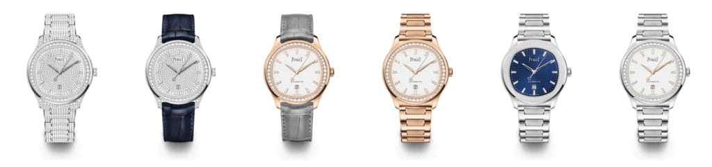 Piaget dévoile deux modèles raffinés de 36 mm en acier inoxydable, l’un avec bracelet en acier assorti et l’autre mêlant détails polis et satinés ; le premier avec splendide cadran bleu Piaget foncé ponctué d’index en or sertis de diamants, et le second avec cadran blanc immaculé avec lunette sertie de diamants étincelants, rehaussé d’aiguilles en or et d’index en or sertis de diamants. Deux somptueux modèles en or rose dotés de cadrans blanc neige et de diamants scintillants s’agrémentent d’un bracelet en alligator gris anthracite ou en or rose intégral. Pour les adeptes des pierres précieuses, Piaget présente deux montres entièrement pavées équipées respectivement d’un bracelet en alligator bleu foncé ou entièrement pavé de diamants.