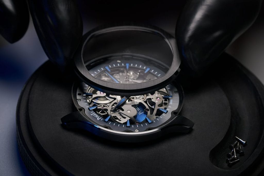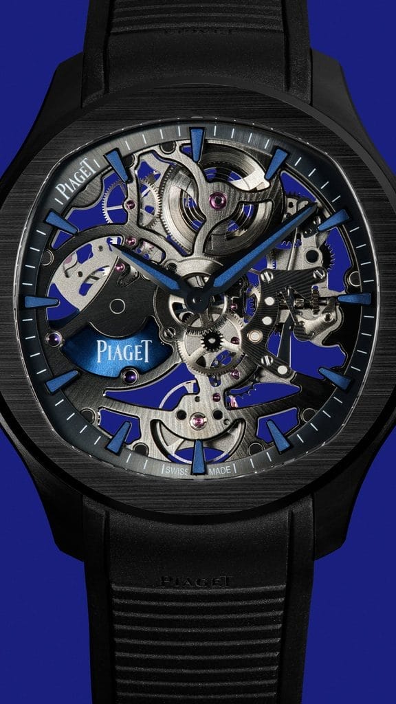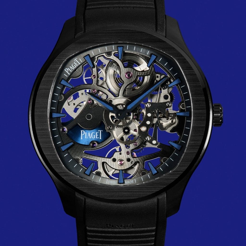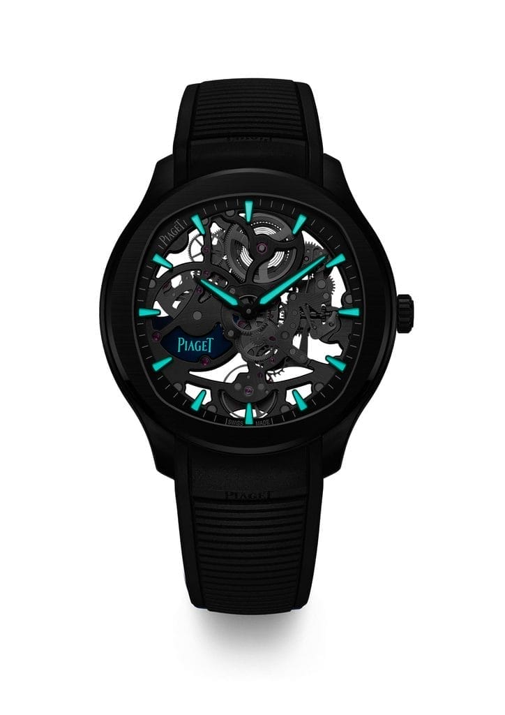 Alimentée par le calibre de manufacture squelette extra-plat à remontage automatique 1200S1, la montre ultranoire est rehaussée de sublimes détails en Superluminova® qui apportent un effet de contraste : sur les index, les aiguilles et, pour la première fois, sur le logo Piaget ornant la masse oscillante. Ce parti pris esthétique confère au modèle un dynamisme particulier, auquel s’ajoute la diversité stylistique du bracelet doté d’un système interchangeable SingleTouch qui a fait son apparition pour la première fois sur la Piaget Polo Quantième Perpétuel Extra-Plate en 2023. La montre peut ainsi être montée sur différents bracelets, en caoutchouc noir, en acier et titane à boucle déployante ou, nouveauté, en caoutchouc bleu.