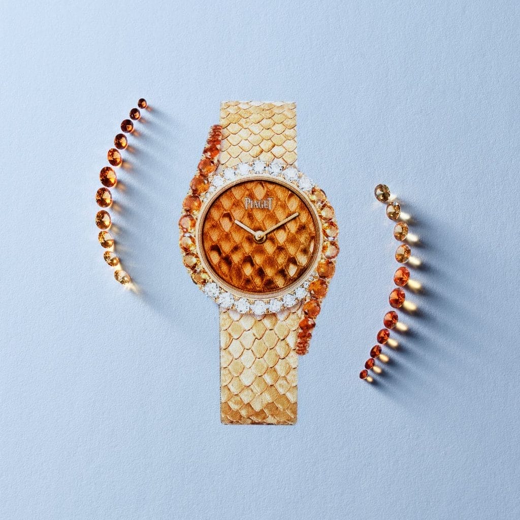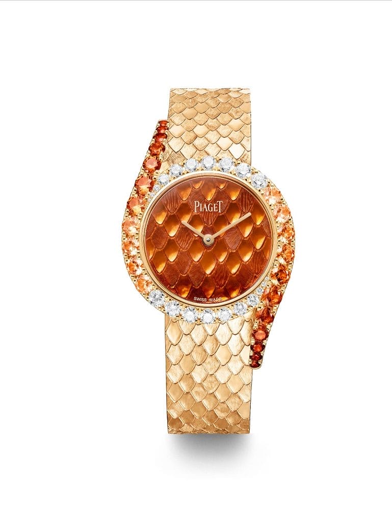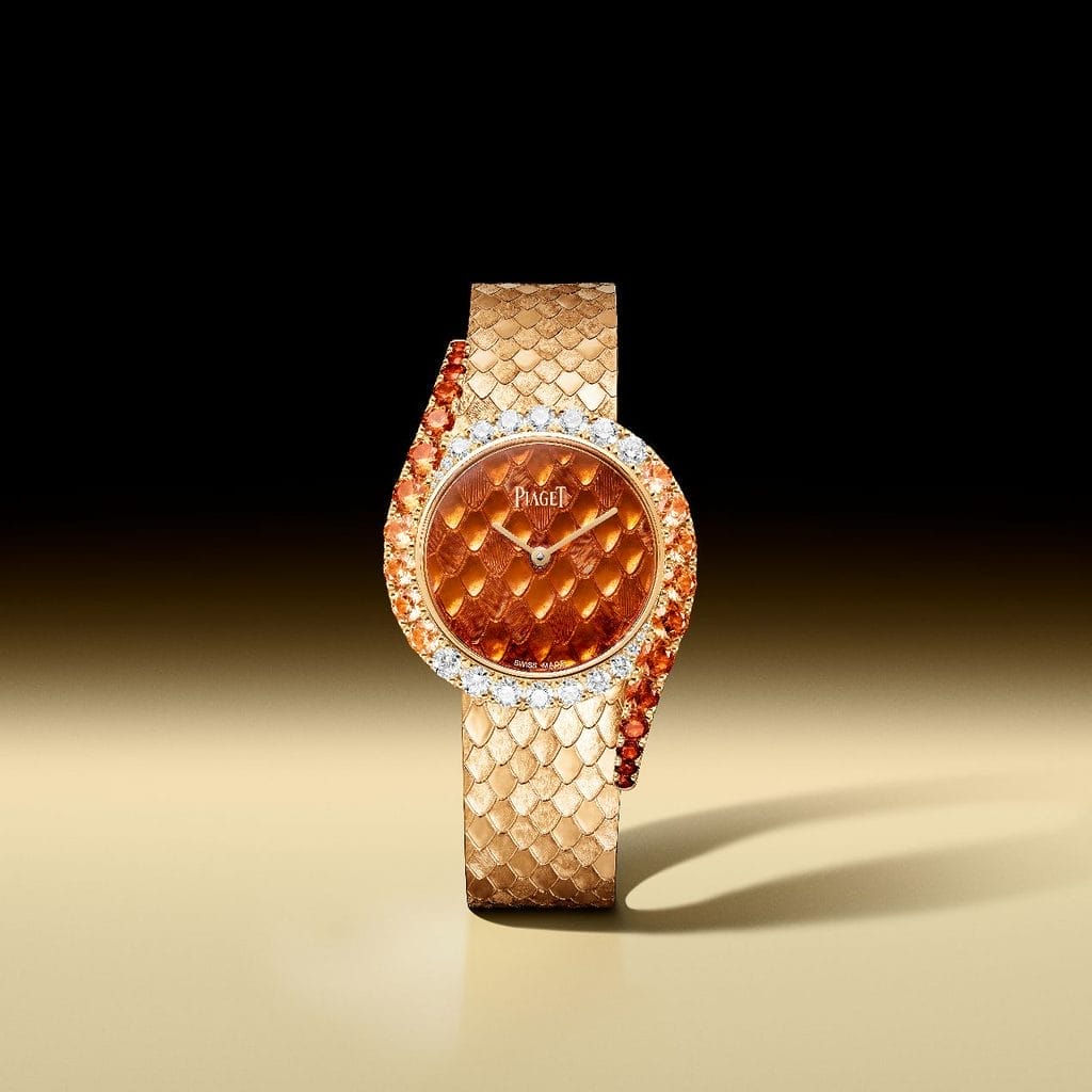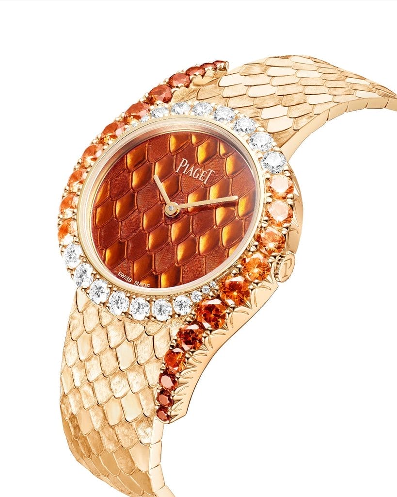La première nouveauté 2026 s’impose d’emblée par son intensité. Le cadran en émail Grand Feu orange vif irradie sur un fond d’or gravé d’un motif reproduisant la peau du serpent. Un généreux filet de diamants entoure le boîtier rond avant de se fondre dans les tonalités orangées de grenats spessartites, se propageant sur le bracelet également gravé d’écailles.