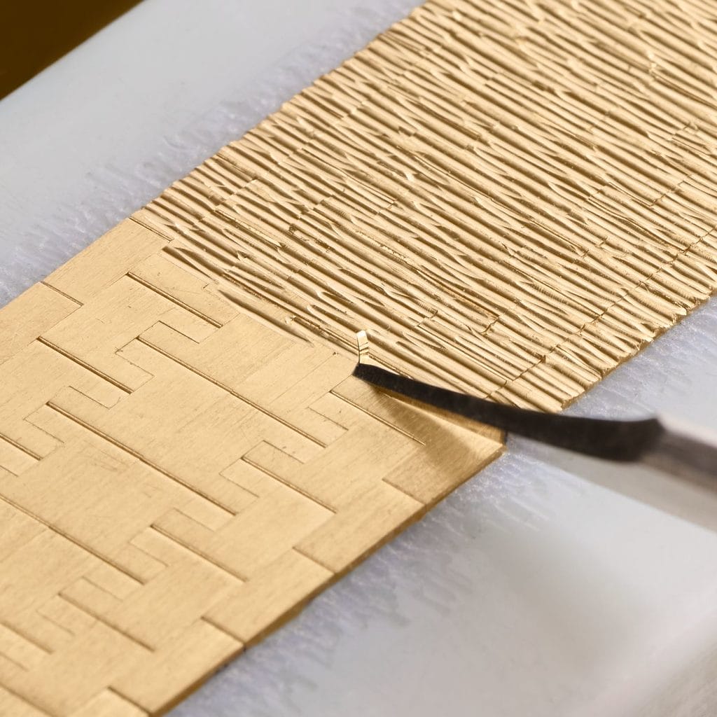 Chaque rainure est incisée à la main, une à une, à l’aide d’un burin. Après chaque geste, l’orfèvre balaie délicatement les copeaux d’or. La pression, l’angle, le rythme diffèrent selon l’artisan, rendant chaque gravure unique. La lumière accroche ces sillons organiques et se diffuse comme sous les feux de la rampe, en écho au nom même de la Limelight.