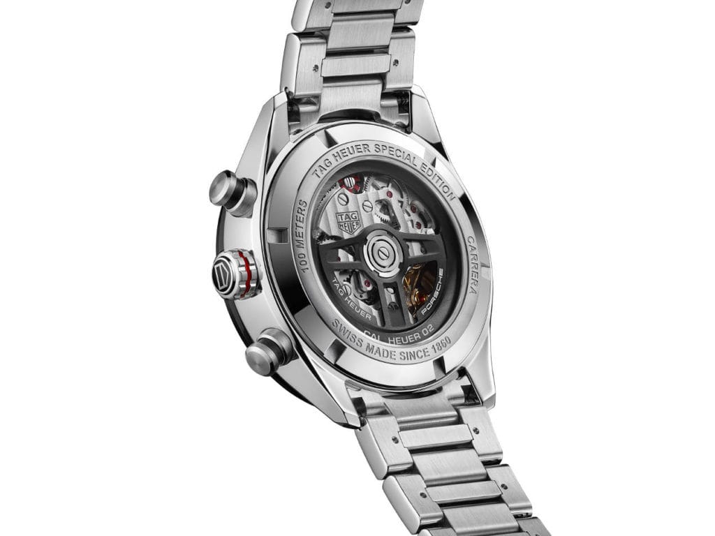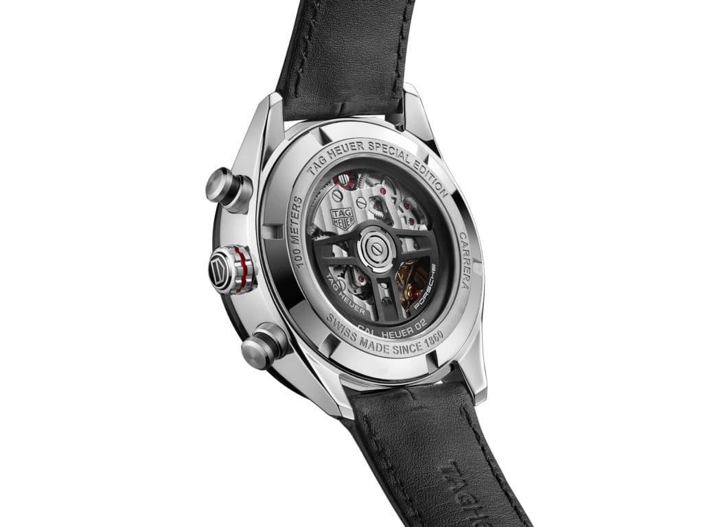 L’inscription Porsche est gravée sur la lunette et sa police de caractères unique est également reprise sur les index. Les couleurs Porsche que sont le rouge, le noir et le gris – qui rappellent également les modèles historiques de Heuer – viennent en rappel sur la montre, et la masse oscillante, redessinée en hommage au célèbre volant de Porsche, est clairement visible à travers le fond en verre transparent du boîtier marqué des inscriptions « Porsche » et « TAG Heuer ». L’effet asphalte utilisé pour le cadran et créé spécialement pour cette montre, exprime parfaitement cette passion commune pour la route, tandis que les chiffres arabes rappellent les chiffres du tableau de bord des superbes voitures de sport Porsche.