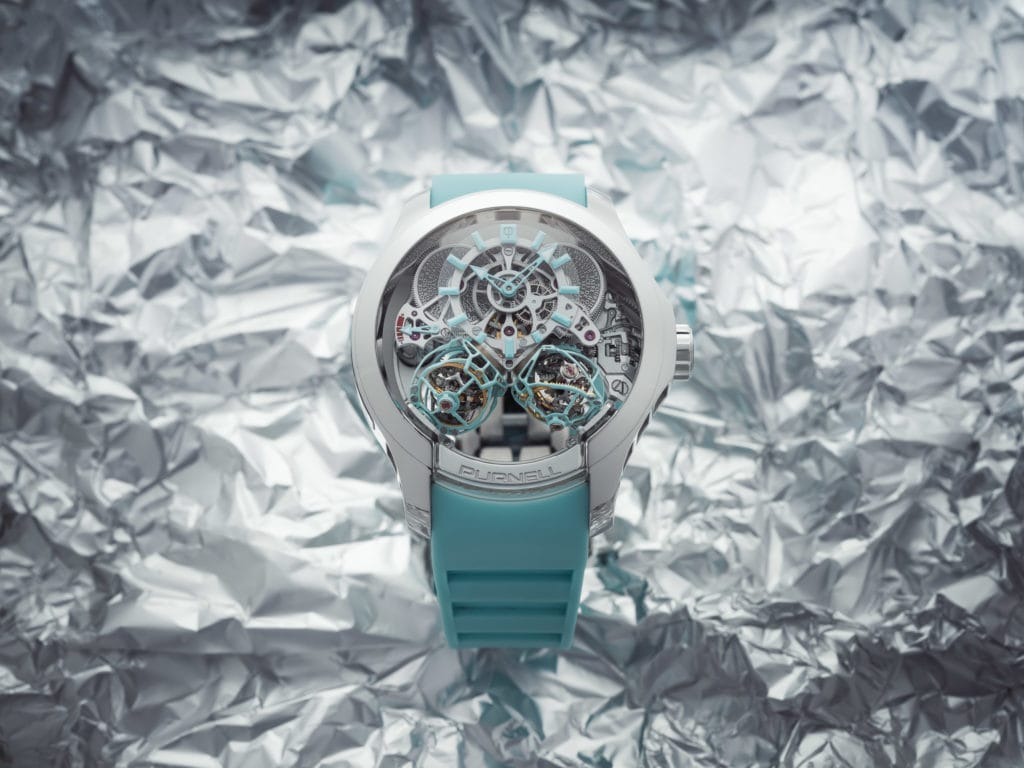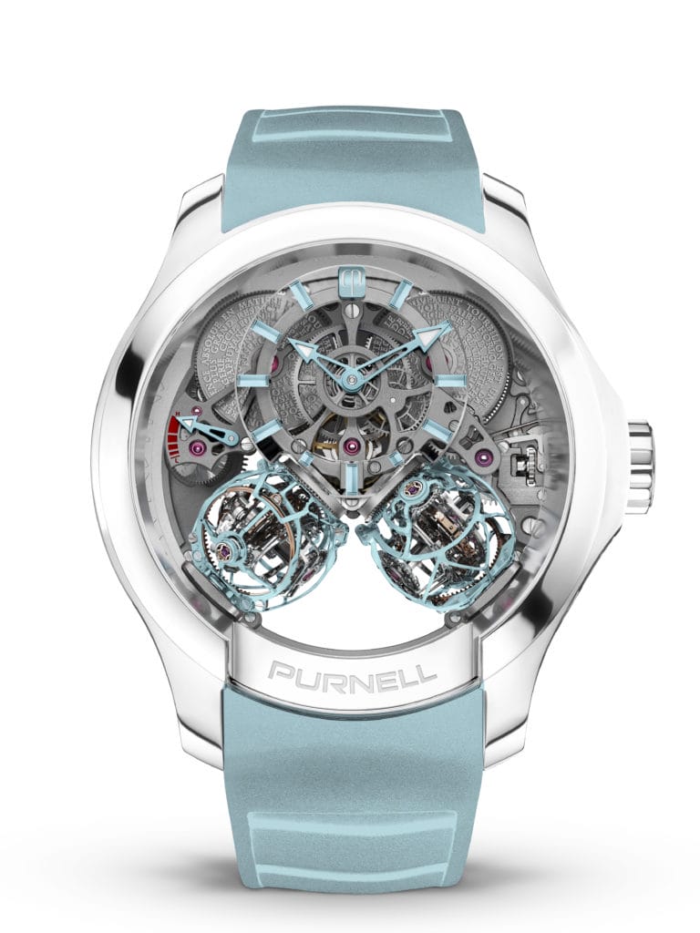 Pour couronner le tout, Purnell a eu l’audace d’habiller ses deux Spherion d’un bleu arctique rare et particulièrement séduisant. Une touche polaire mise en valeur par un cadran des heures et minutes également en saphir avec des indexes laqués bleu arctique. Cette pièce rare en édition limitée de 8 pièces émerveillera les passionnés de beauté mécanique.