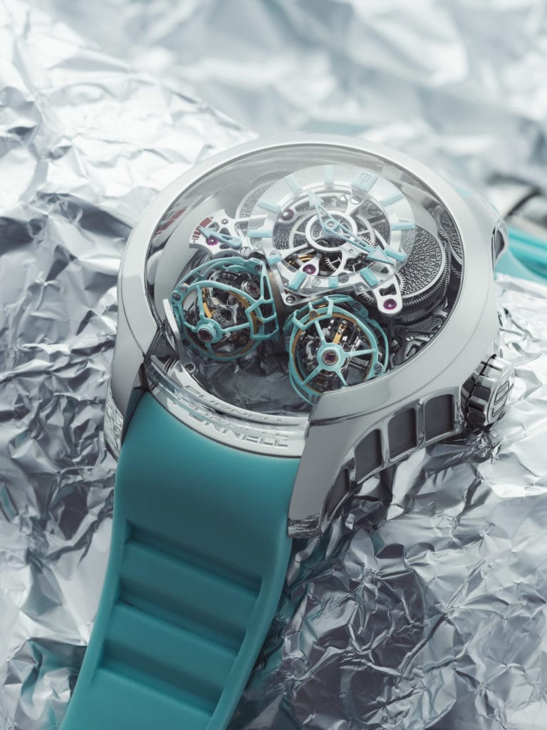 Purnell dévoile en ce début d’année une création tout en élégance, la pièce Escape II Double Spherion Icy Blue avec une boîte en platine et des finitions couleur bleu arctique. La collection Escape II de la maison Purnell, déjà fameuse pour ses deux tourbillons trois axes à haute vélocité s’habille du matériel le plus précieux, le platine, dont le raffinement s’associe à la pureté, l’éclat et la longévité.