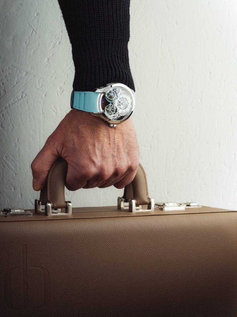 Son dôme en saphir dévoile un mécanisme horloger fascinant en effet, la cage intérieure du Spherion accueillant le balancier effectue un tour complet sur elle-même en 8 secondes seulement. La deuxième cage accomplit sa révolution en 16 secondes tandis que la cage extérieure tourne en 30 secondes. Une prouesse horlogère que seule Purnell est en mesure d’accomplir à ce jour grâce au génie de son maître horloger-concepteur Eric Coudray.