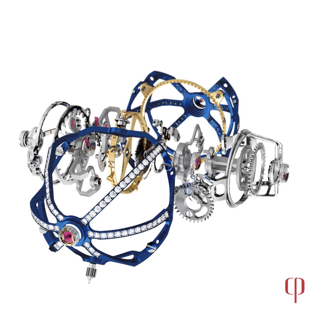Double Spherion avec cages serties de diamants – le tourbillon à trois axes le plus rapide du monde ; appelé « Spherion », par son inventeur le Maître horloger Eric Coudray (gagnant du prix horloger Gaïa en 2012)
