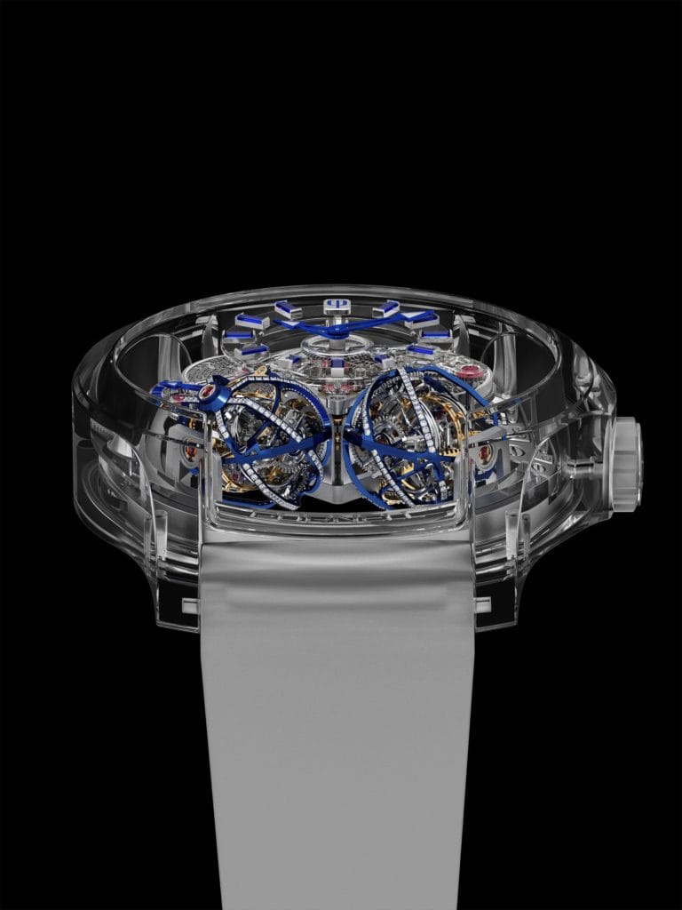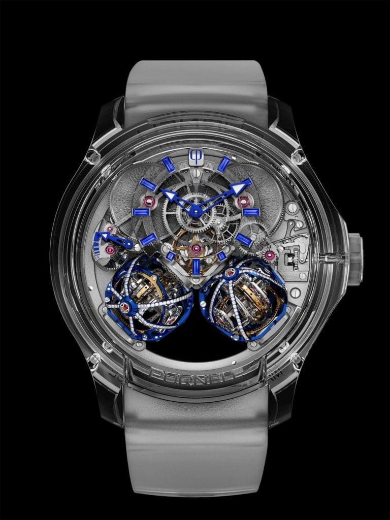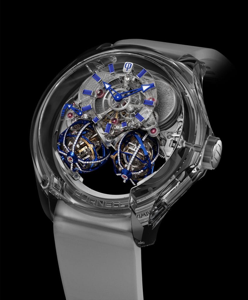 Le premier Double Tourbillon à trois axes au monde dans une boite entièrement en saphir avec des ponts de mouvement et un cadran en saphir.