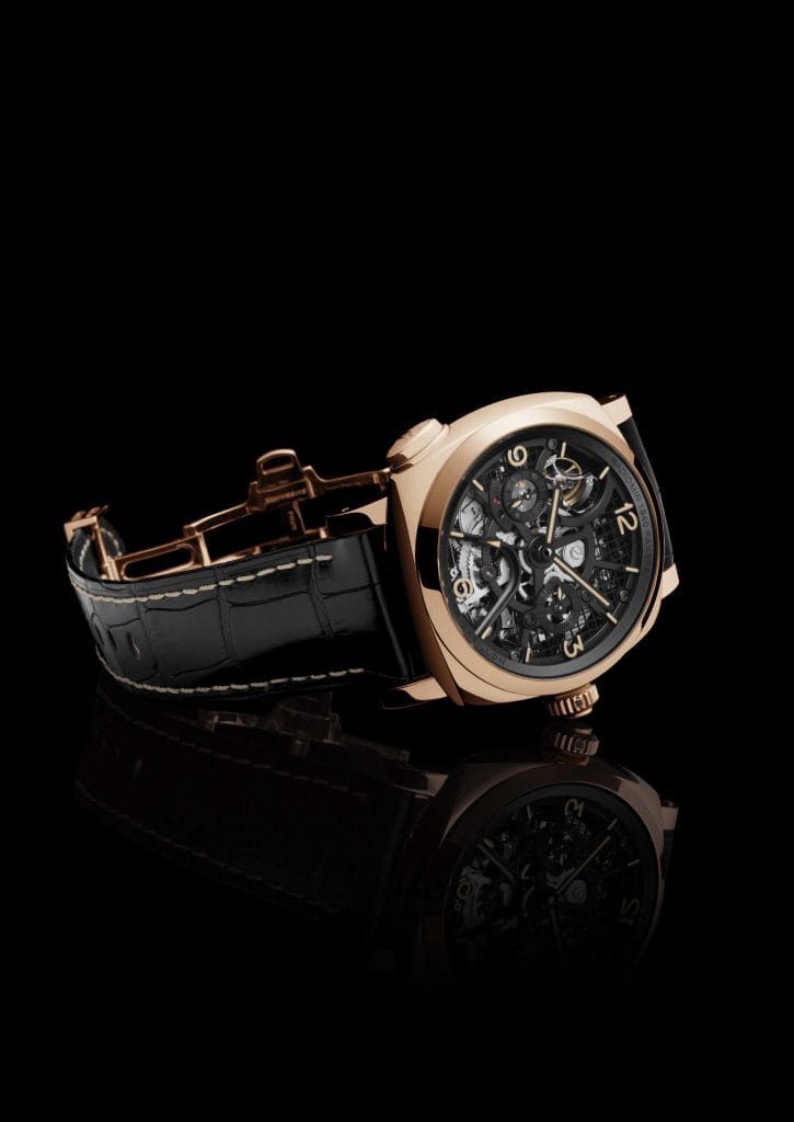 MUNIE D’UN RÉGULATEUR À TOURBILLON EXCLUSIF ET D’UN DOUBLE MÉCANISME DE RÉPÉTITION MINUTE OPÉRANT DANS DEUX FUSEAUX HORAIRES, LA NOUVELLE RADIOMIR 1940 MINUTE REPEATER CARILLON TOURBILLON GMT EST TECHNIQUEMENT LA MONTRE LA PLUS COMPLEXE JAMAIS RÉALISÉE PAR LA MANUFACTURE PANERAI DE NEUCHÂTEL.