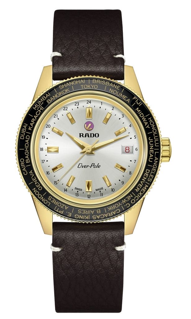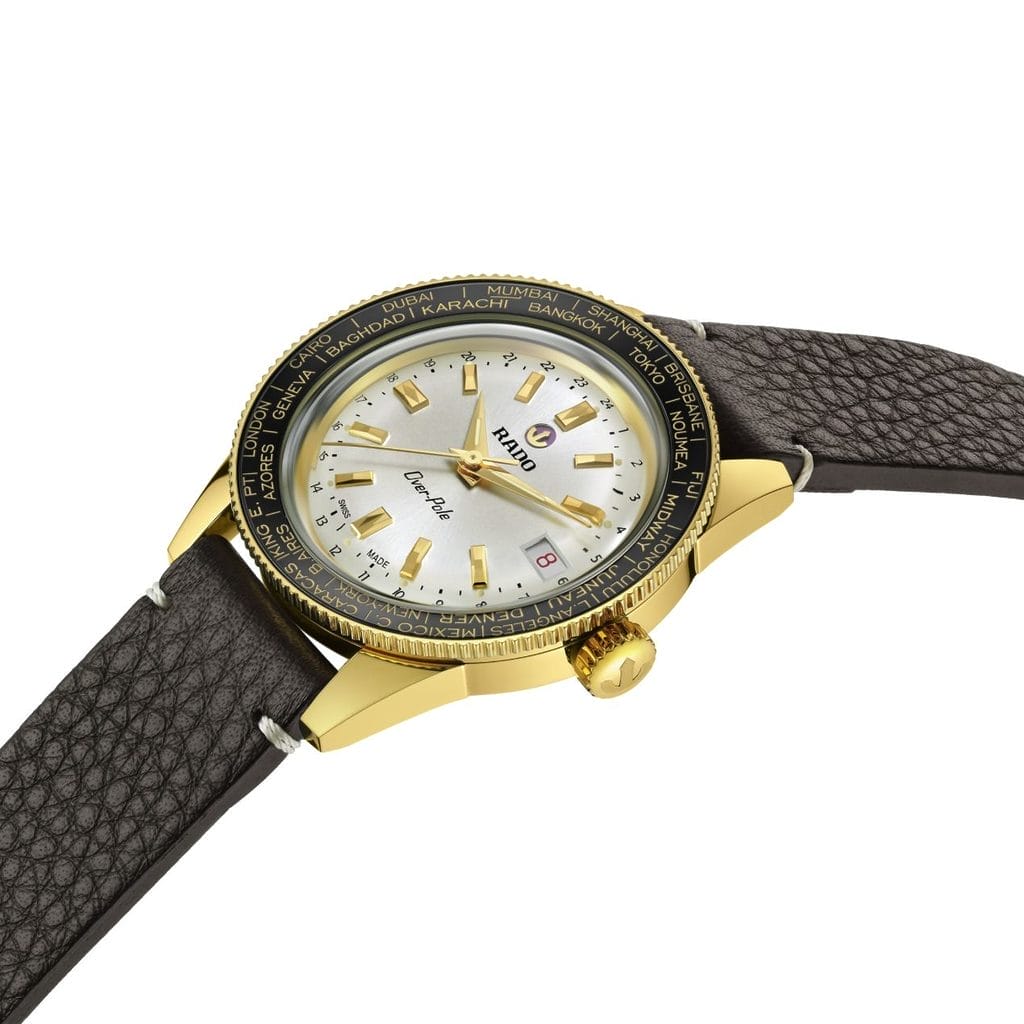 Sous le verre saphir bombé, traité antireflet sur les deux faces, le cadran argenté soleillé déploie un subtil jeu de lumière. Les aiguilles et index incurvés couleur or jaune sont soulignés par un traitement Super-LumiNova blanc vintage. L’échelle des 24 heures, les logos Rado et Over-Pole, et l’heure universelle noire contrastante apportent équilibre et lisibilité. Le symbole emblématique de l’ancre mobile Rado se détache en or jaune sur fond rubis.