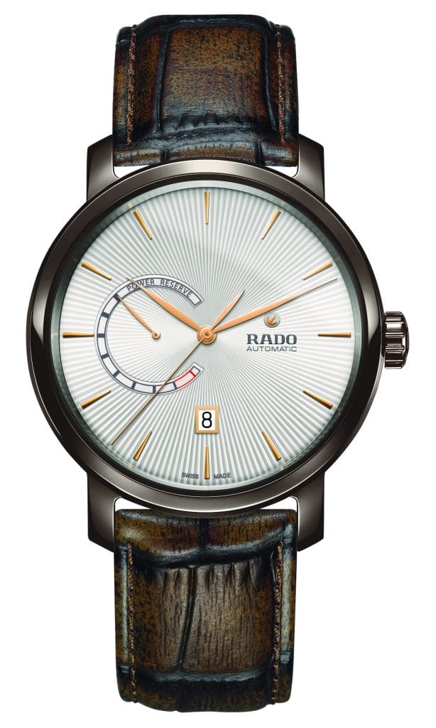 Cadran blanc avec motif ensoleillé, index appliqués couleur or rose, indicateur de réserve de marche à 9 heures, réhaut brun, symbole de l’ancre mobile couleur or rose, logos Rado et Automatic imprimés en gris