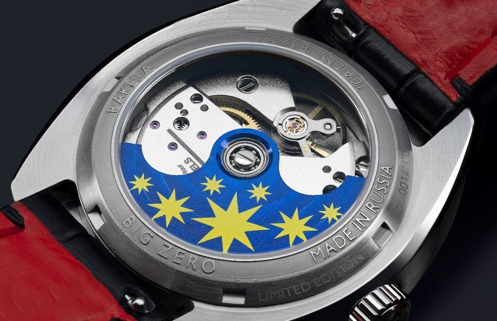 Au cœur de la montre bat un mouvement automatique russe, fabriqué intégralement au sein de la manufacture Raketa Watch Factory, l’une des rares au monde à produire ses mouvements en interne. Le fond de boîte transparent permet d’admirer le mouvement ainsi que sa masse oscillante décorée du motif des vagues de la Neva.