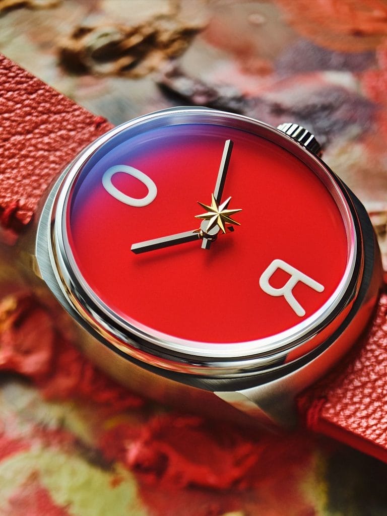 Le design de la montre met en avant le rouge signature de Masha Yankovskaya, une couleur également emblématique de Raketa. Au centre du cadran figure une étoile en rotation, issue du langage visuel vibrant de l’artiste et inspirée de son tableau Star appartenant à la série Tarot. Dans les arcanes majeurs, l’Étoile correspond à la dix-septième carte, symbole d’espoir, d’inspiration et de guérison. Sur la montre Raketa, cette idée se traduit par l’aiguille des secondes, qui associe une dimension artistique symbolique au rythme du temps. L’étoile évoque également le thème de l’espace, historiquement important pour Raketa, dont la naissance est liée au vol historique de Yuri Gagarin.