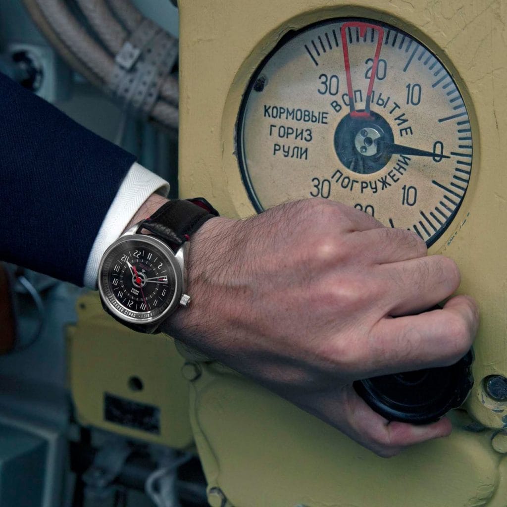 - Le mouvement automatique 24 heures (calibre Raketa 2624A) permet aux sous-mariniers de distinguer le jour de la nuit dans les profondeurs des océans,