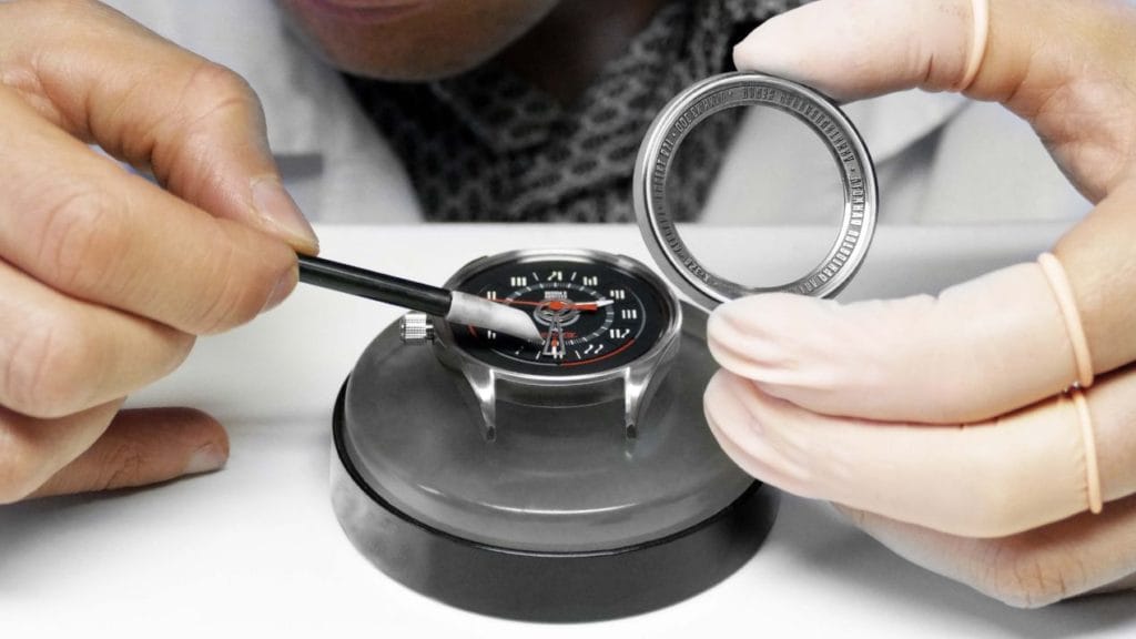 Et David Henderson-Stewart nous a fait la confidence que ce métal est très difficile à travailler. Il a fallu encore toute la prouesse des opérateurs Raketa pour fraiser et graver ces parties métalliques afin de les intégrer dans chacune des 300 montres produites.