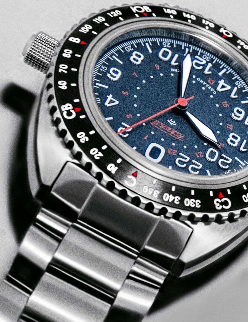 Un mécanisme automatique russe très fiable, intégralement produit par la Manufacture Horlogère “Raketa” à Saint-Petersbourg, est logé dans le boîtier en acier doté d’une lunette en titane.