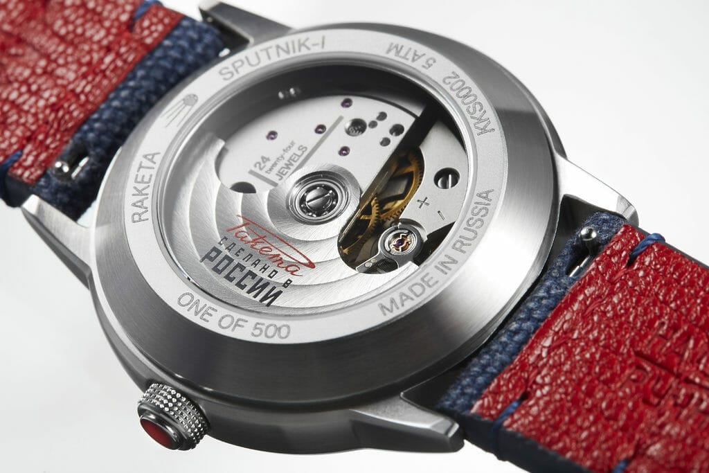 Le fond de la montre révèle un mouvement automatique de 24 heures magnifiquement décoré et entièrement fabriqué par la manufacture horlogère Raketa de Saint-Pétersbourg — le célèbre mouvement Raketa 2624. La montre Raketa Spoutnik-1 a un mouvement 24 heures car il est impossible de distinguer le jour de la nuit dans l’espace en regardant un simple cadran de 12 heures : il faut un cadran 24 heures !