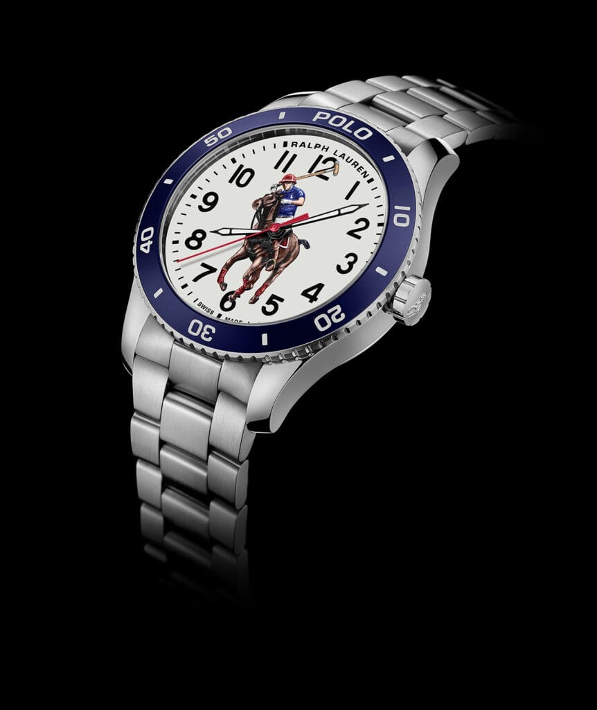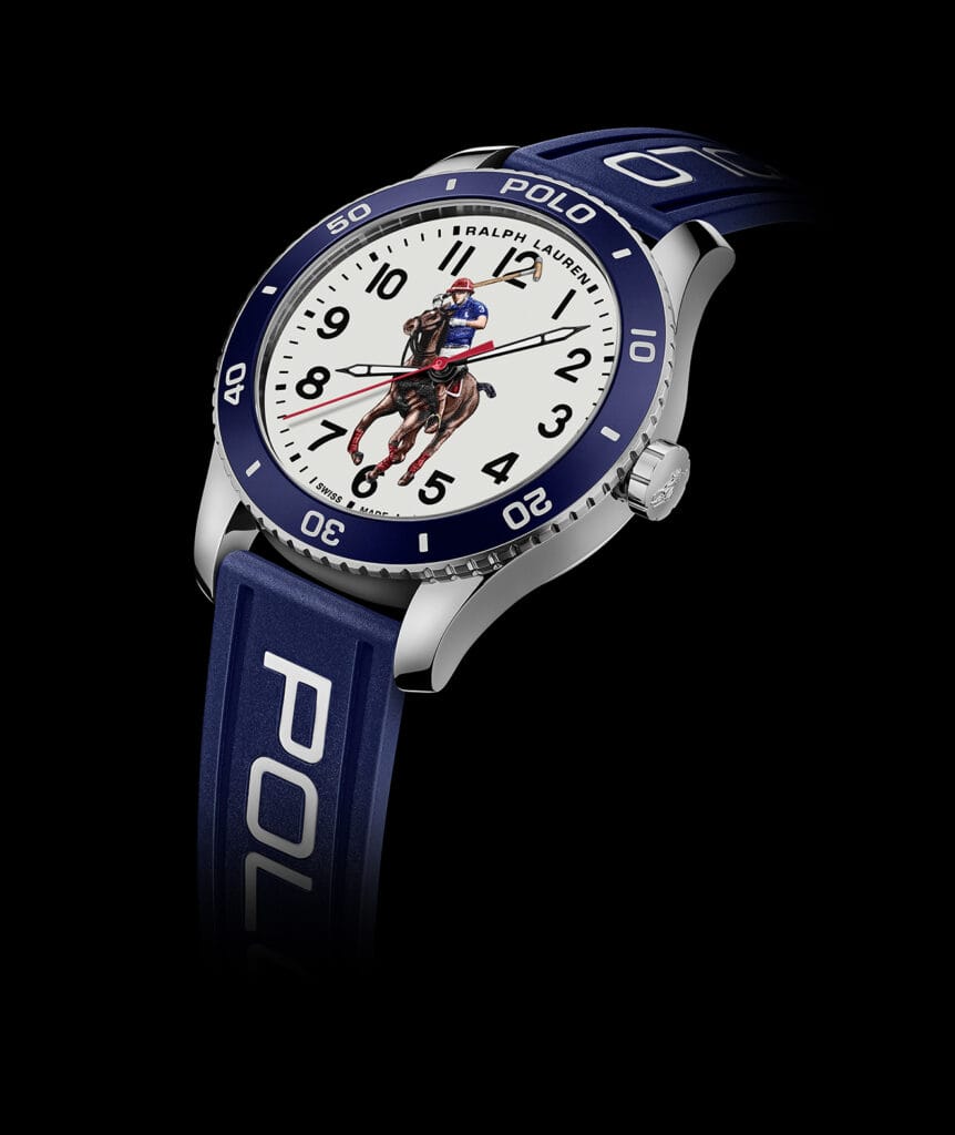 En 1972, Ralph Lauren apposait pour la première fois sur ses polos, son célèbre emblème représentant l’instant avant que le maillet ne frappe la balle. Une image qui serait bientôt reconnue de tous. Passant de la poitrine au poignet, le joueur de polo est ici revisité dans une impression 3D multicouche dont les couleurs vives sont complétées par des chiffres arabes luminescents sur un cadran laqué, entouré d’une lunette en aluminium anodisée sur un boîtier en acier inoxydable.
