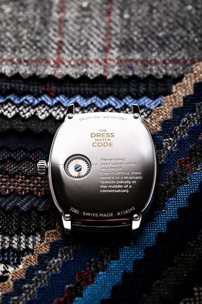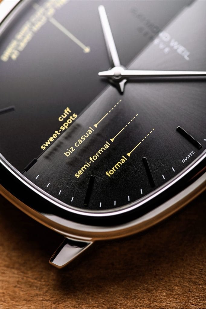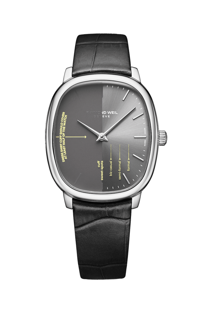 Cette édition limitée, référence 2280, joue sur un dialogue subtil entre élégance et rigueur. Le boîtier en acier inoxydable renferme un cadran anthracite dont la composition est divisée en deux. La partie gauche, volontairement plus discrète, masque certains détails pour rappeler le principe même du modèle : la chemise doit recouvrir au moins la moitié du cadran. Sa finition opalin anthracite mate et ses index imprimés en transparence assurent malgré tout une lisibilité parfaite. À 9 h, un texte jaune Pantone 7402C énonce la règle : “Dress shirt cuff should cover at least half of the watch”. Sur la glace saphir, d’autres indications jouent avec les codes vestimentaires : biz casual, semi-formal, formal, une échelle volontairement décalée.