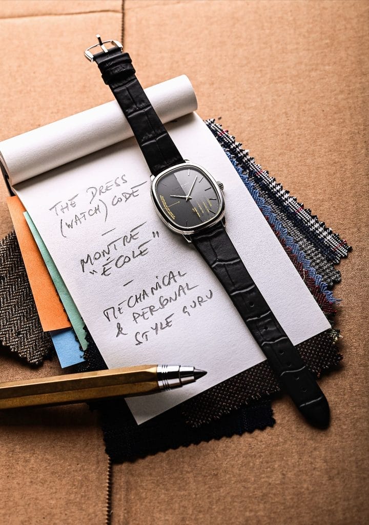 Cette édition limitée, référence 2280, joue sur un dialogue subtil entre élégance et rigueur. Le boîtier en acier inoxydable renferme un cadran anthracite dont la composition est divisée en deux. La partie gauche, volontairement plus discrète, masque certains détails pour rappeler le principe même du modèle : la chemise doit recouvrir au moins la moitié du cadran. Sa finition opalin anthracite mate et ses index imprimés en transparence assurent malgré tout une lisibilité parfaite. À 9 h, un texte jaune Pantone 7402C énonce la règle : “Dress shirt cuff should cover at least half of the watch”. Sur la glace saphir, d’autres indications jouent avec les codes vestimentaires : biz casual, semi-formal, formal, une échelle volontairement décalée.