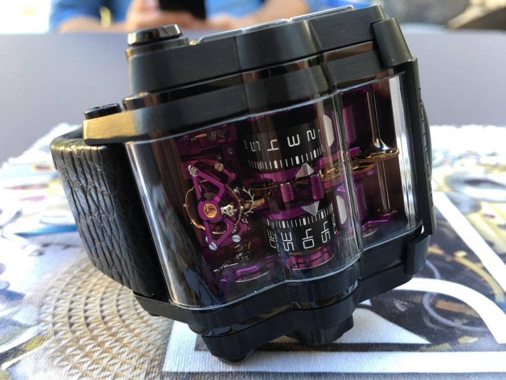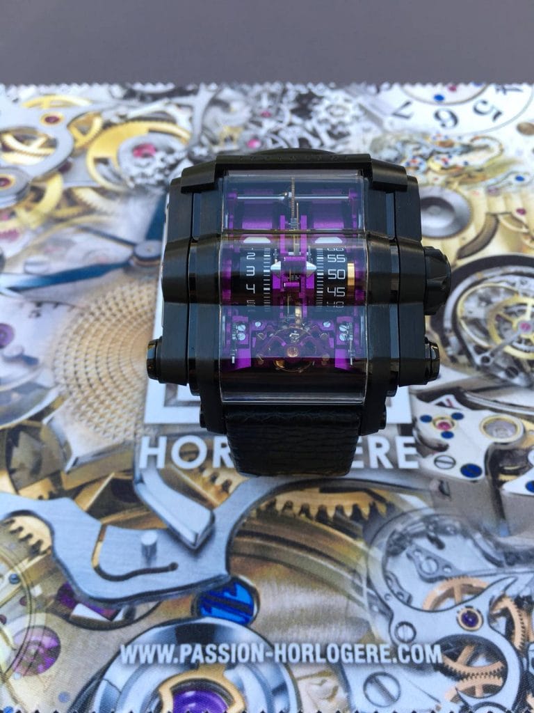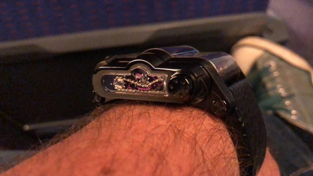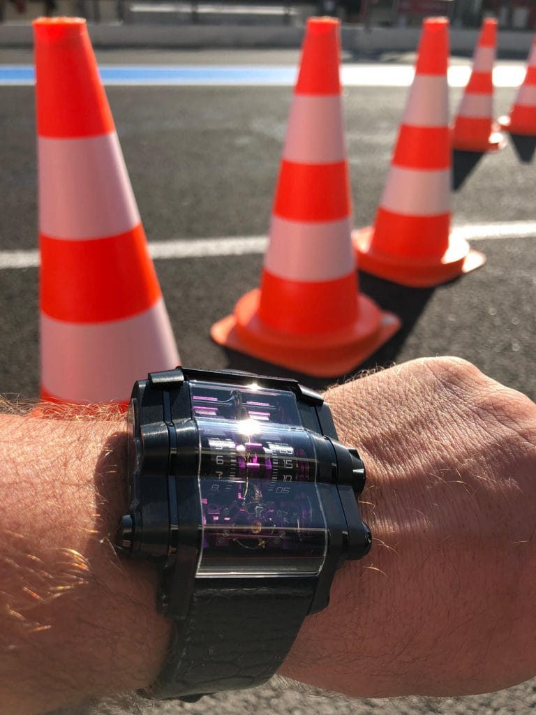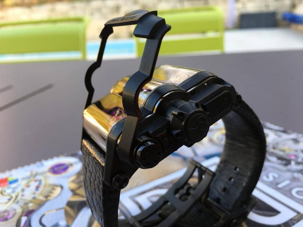 Lorsque vous l’avez au poignet, il est vrai que cette montre ne laisse absolument personne indifférent. Certains aiment, d’autre moins… Cependant au poignet, elle est très confortable et très visible. C’est une montre qui a une réelle présence et si vous voulez vous amuser et amuser un petit peu les gens autour de vous, actionnez tout simplement le levier de remontage … ça ne laisse personne indifférent !