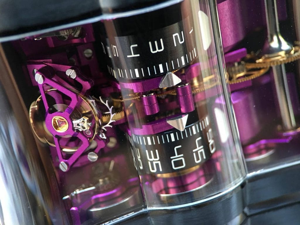 Les fonctions de cette montre sont uniquement les heures et les minutes que l’on peut voir sur les deux rouleaux qui sont placés de manière centrale sur le cadran de cette montre. Ce mouvement a été réalisé spécialement pour cette montre et on y retrouve 693 composants.