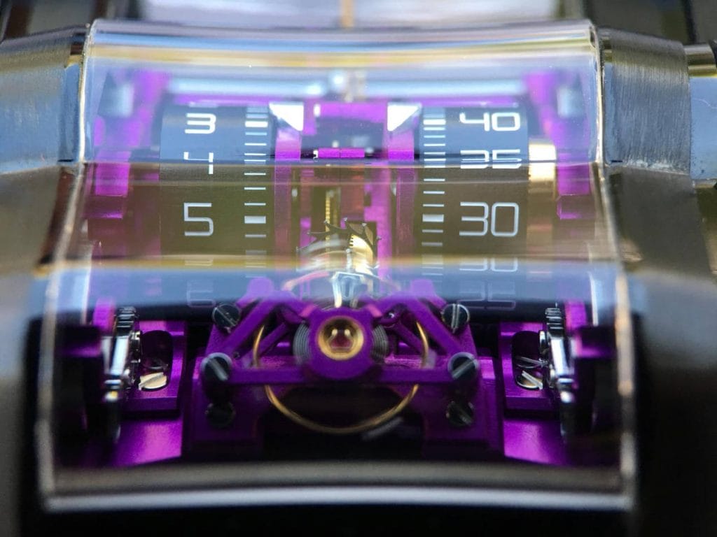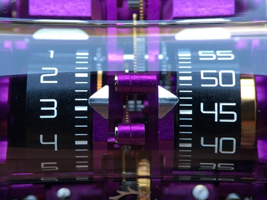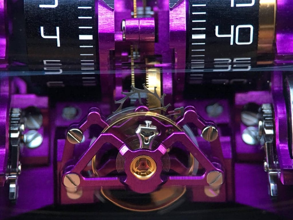 Ce mouvement est en aluminium, comme déjà évoqué. Sur cette version de la T1000, il est de couleur mauve. Bien évidemment cette couleur peut être changée et il s’agit là d’une personnalisation pour satisfaire une demande particulière d’un client.