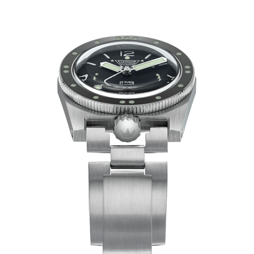 Il s’agit donc de deux nouvelles références qui nous sont offertes : GF38163 – S2 et GF38263 – S3. Elles nous arrivent des grands fonds avec un nouveau diamètre de 39mm qui ravira aussi bien les dames que les messieurs. Le boîtier monobloc en acier 316 L de la Grand Fond conserve les lignes, les angles très saillants et les arrondis qui lui ont permis de traverser le temps en surfant par delà les modes et les tendances. Son design d’une grande pureté, à la fois singulier et intemporel, se retrouve dans le moindre détail. Ainsi, le verre en saphir de type glass box adopte la courbure du plexiglas d’antan et vient coiffer un cadran également bombé et sans rehaut.