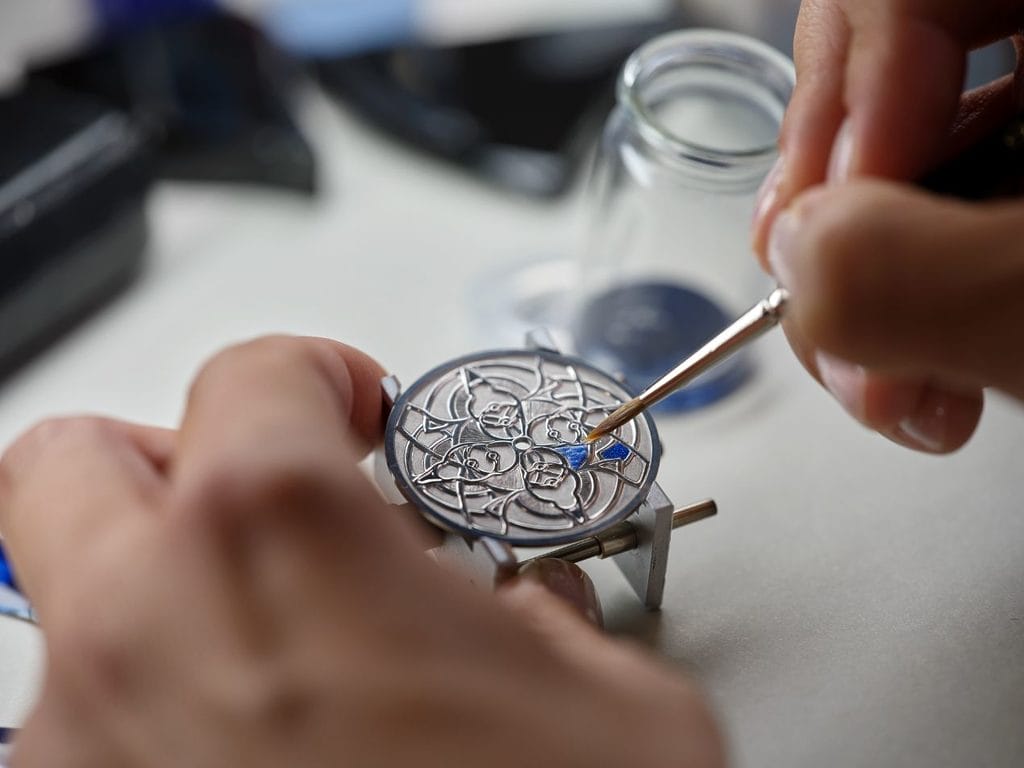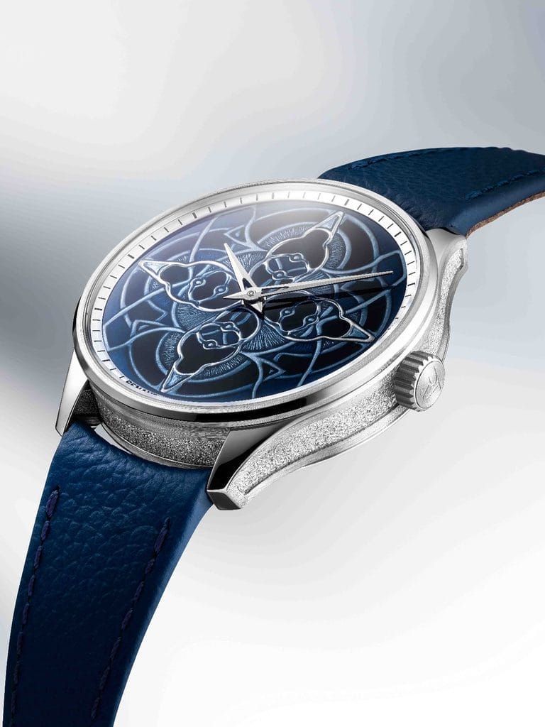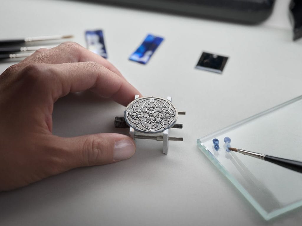 Dès les premières esquisses, leurs équipes ont travaillé main dans la main sur les proportions, les couleurs et les volumes, aboutissant à une pièce cohérente jusque dans la gravure du fond de boîte, sceau d’une double filiation technique et artistique.