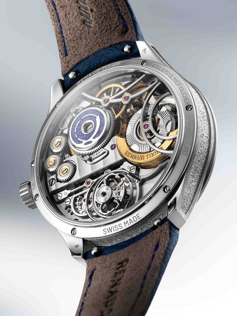 Le calibre RVI2023, développé spécifiquement pour ce projet, illustre la philosophie de Dominique Renaud : partir de l’idée pour construire le mouvement, et non l’inverse.