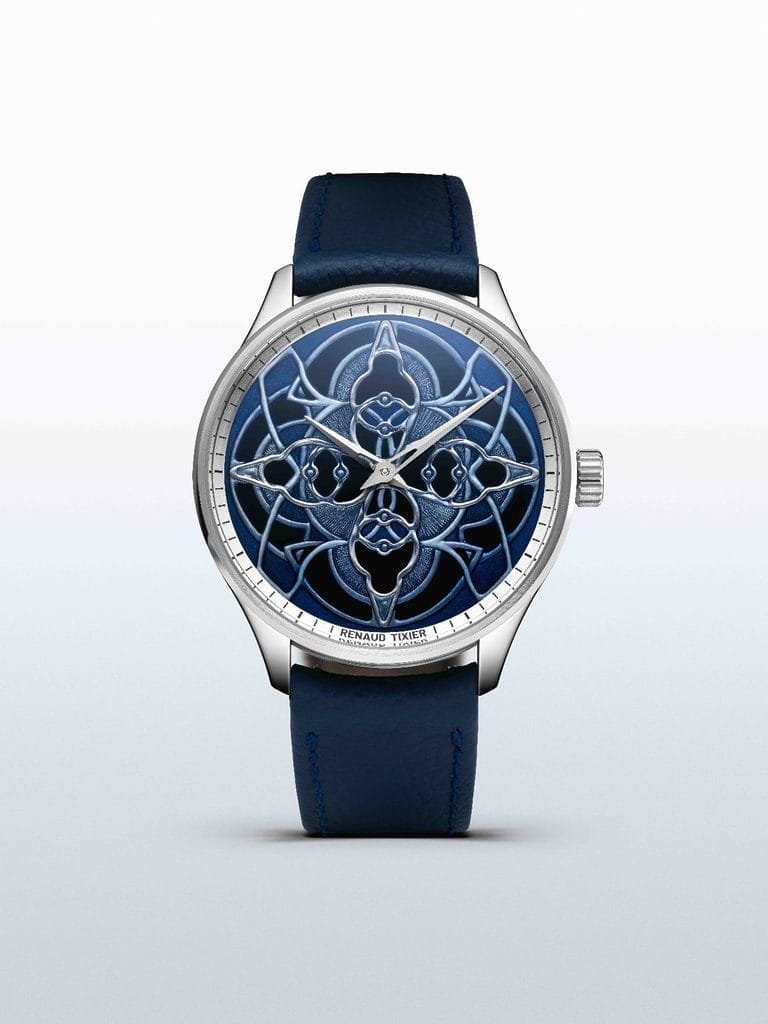 Le motif du cadran, en nuances de bleu translucide, résulte de l’émail teinté appliqué sur différents niveaux de gravure. Il propose une interprétation kaléidoscopique de composants stylisés du calibre RVI2023, agencés en une ronde harmonieuse. Cette composition géométrique et organique évoque un ballet mécanique figé dans le temps, mêlant mystère horloger et poésie visuelle.