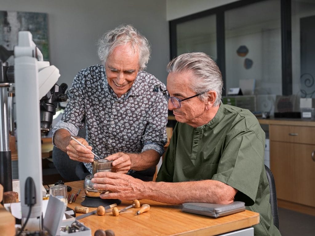 Dominique Renaud, fondateur de Renaud & Papi et pionnier de la modernité horlogère, a toujours défendu l’idée que l’innovation naît de la rencontre des savoirs. Olivier Vaucher, maître incontesté des métiers d’art appliqués à l’horlogerie depuis 1978, incarne quant à lui l’excellence d’un atelier qui a collaboré avec les plus grandes maisons tout en préservant une liberté créative précieuse.